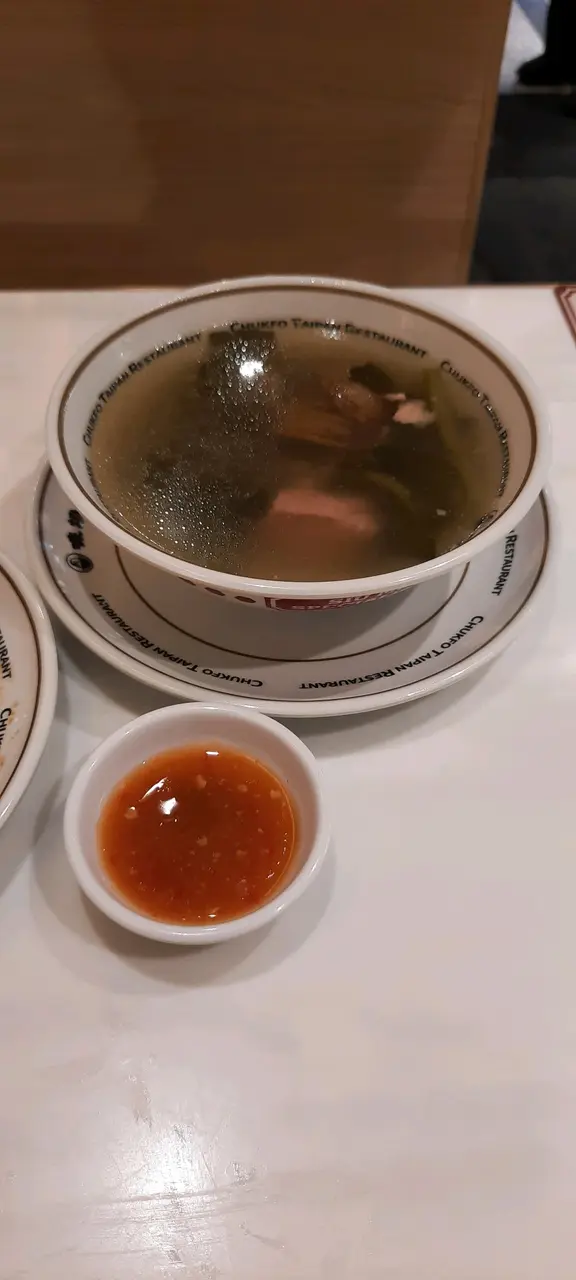 ,唔會有羶味。酸梅醬就略嫌不夠濃味。最後我哋加配左一碗當日嘅例湯,如圖中所見湯渣比湯水多