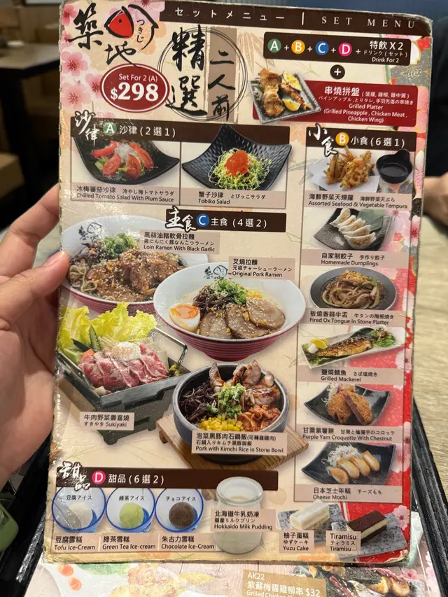 東京剛剛旅行回來,忘不了築地海鮮的味道,放工同朋友去sogo攞袋,路過銅鑼灣餐廳一帶,見到百利中心樓上鋪頭築地名字倍感親切,試一試無所謂。到達店前,未有人排隊。一坐低發現二人前的餐牌價錢很親民,298可以前菜,小食,主食飲品甜品都有。選擇的二人前餐牌。座位有提供消毒噴霧,好似回到疫情前用餐的感覺。
