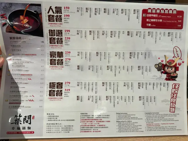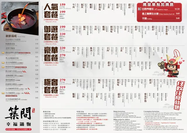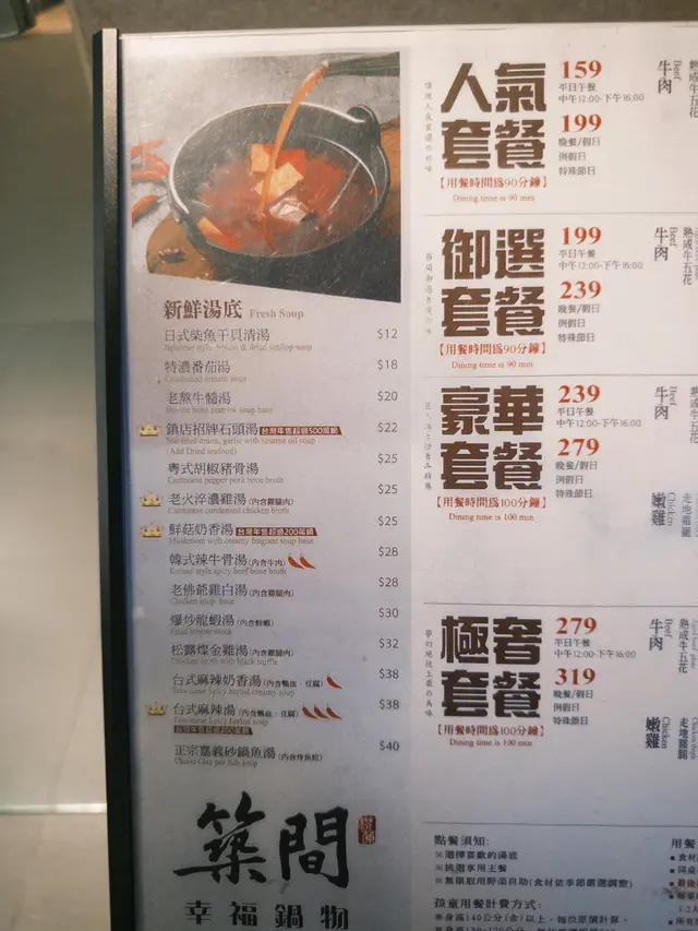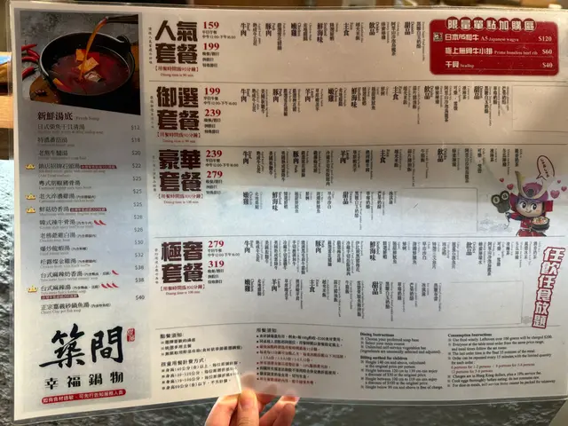 最近同朋友去咗築間幸福鍋物試下佢哋嘅極奢放題,一人$319, 價錢都好合理最驚喜係佢哋嘅湯底,叫左個鎮店招牌石頭湯,另外老火淬濃雞湯都係一絕,濃郁到入口都係陣陣雞香味。下次會再想試吓正宗嘅砂鍋魚湯出邊都會有自助bar, 感覺非常之乾淨企理亦都有大量嘅蔬菜同埋唔同嘅台式配料選擇講到海鮮,一定要推介海潮鮮鱸魚同埋龍躉石斑魚片,肉質新鮮彈牙,放落滾湯嗱一嗱就食得,魚肉超嫩滑!海虎蝦同鮮蝦都係必食推介,個頭大大,肉質爽甜,配埋個湯底超正!至於三文魚片就油香十足,肥美嫩滑。各款海鮮包括沙白同鮮蚵都好新鮮,特別係個鮮蚵,鮮甜多汁,一啲腥味都冇。肉類方面,美國熟成霜降牛同澳洲黑毛和牛霜降簡直係極品,肉質超嫩,油花分佈均勻,一入口即溶!冷藏手切溫體牛新鮮度一流,肉味香濃。伊比利黑豬梅花同松阪豬都係精選,油脂豐富,肉質軟嫩多汁。最後dessert環節都唔馬虎,黑糖白玉奶酪香濃滑嫩,草莓同芒果奶酪都好有水準,果香濃郁。焦糖布蕾表面焦脆,入面滑嫩,甜度啱啱好。整體食物嘅質素都好好,唔怪之得係台灣可以咁出名…查看更多
