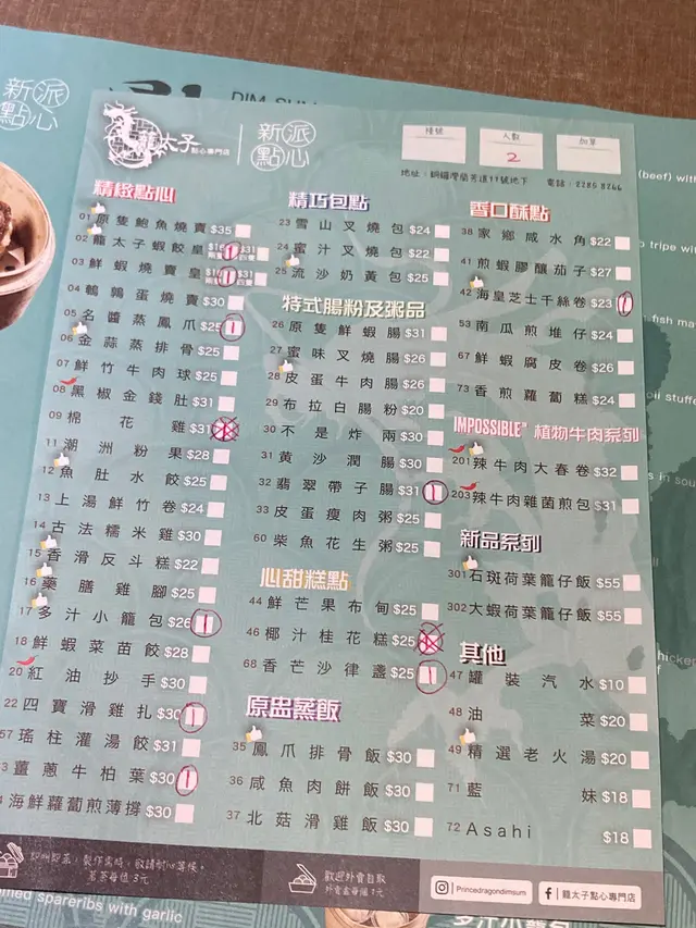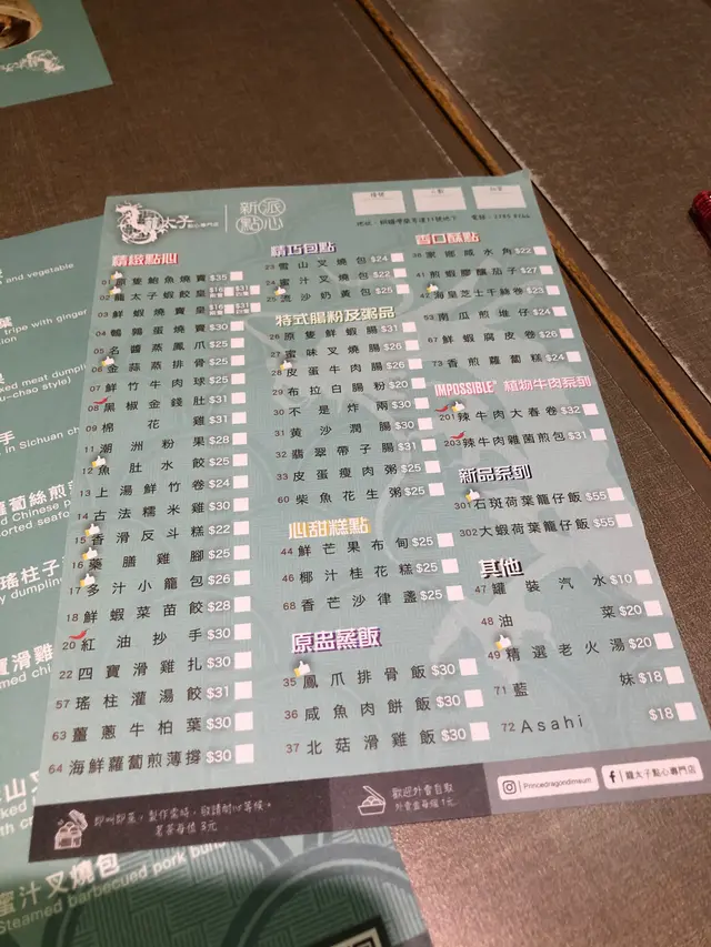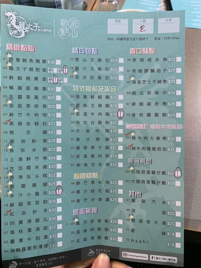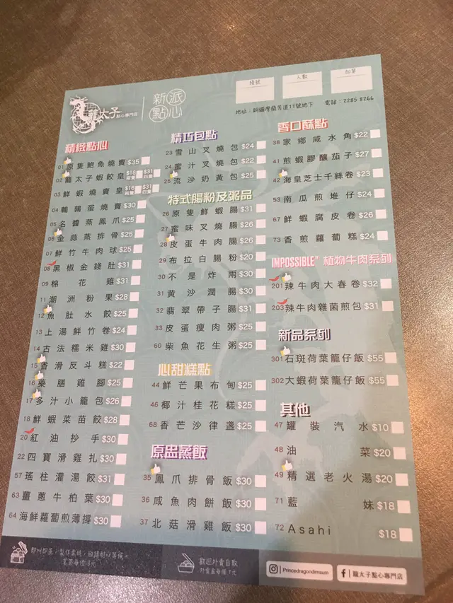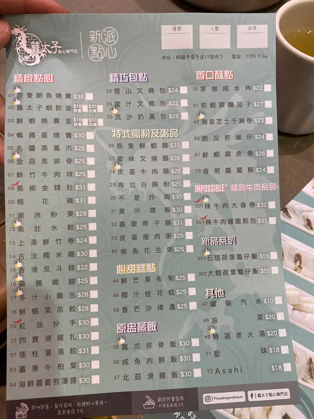 最近好想食點心,所以約咗朋友放工之後嚟呢間市區入邊都幾方便嘅點心小店度食。餐廳自稱主打新派點心,選擇唔算少,但感覺上唔係好有創意好特別嘅點心,大部份都係平時食過知道係乜嘢嚟嘅。每位茶錢只係$3 ,十分之合理。全部都係即叫即蒸。籠太子蝦餃王呢度嘅蝦餃有得揀兩粒或者四粒,唔同價錢,方便而家限最令之下一至兩個人去食嘅時候唔一定要食晒四粒,可以有多幾款選擇食其他嘢。整體來講都幾出色,鄙薄餡靚,入邊嘅鮮蝦都好彈牙。金蒜蒸排骨我自己個人好喜歡食排骨,每次去食點心有蒸排骨或者排骨飯的話都會一定點嚟食。呢個蒸排骨下面墊住排骨嘅竟然係蒜蓉烏冬!震驚了我。排骨有四至五舊,兩點係下面的蒜蓉烏冬,食落又幾出色幾好味真係有創意。多汁小籠包小籠包真係好多汁,每一個有錫紙兜裝住,夾起嘅時候唔小心因為癡住咗個兜,令到啲汁流晒出嚟。小籠包嘅皮唔會好口,入邊嘅餡都幾多,熱辣辣真係好多汁。雪山叉燒包一碟有三個,咬落包嘅口感偏遠,雙層嘅墨西哥皮都冇外面食到嘅咁脆。似係成個蒸出來。外面嘅感覺上墨西哥皮會比較脆。裏面嘅叉燒醬份量都唔少,幾好食。炸兩炸兩有幾搞鬼,網絡真係似炸兩,但係入邊似係一個炸過嘅腐皮卷夾住蝦!略嫌佢哋嘅腸粉皮有少少厚。。潤腸潤腸入邊包住嘅豬潤每一九都幾大舊,臨上表面嘅時候都唔會太咸,謝謝拎上枱嘅時候先至倒落去,真係好有以前細細個去茶樓食點心嘅情懷。煎蝦膠釀茄子呢碟可以話係最唔推介嘅點心款式,雖然我本人係超級喜歡食茄子,但係你都知道茄子要保留外面先紫色嘅話就要經過油炸。雖然蝦餃好好食,但係因為茄子炸過之後吸晒所有油分,而且份量都頗大,一疊四個同朋友分享要每人食兩舊感覺太油膩。查看更多