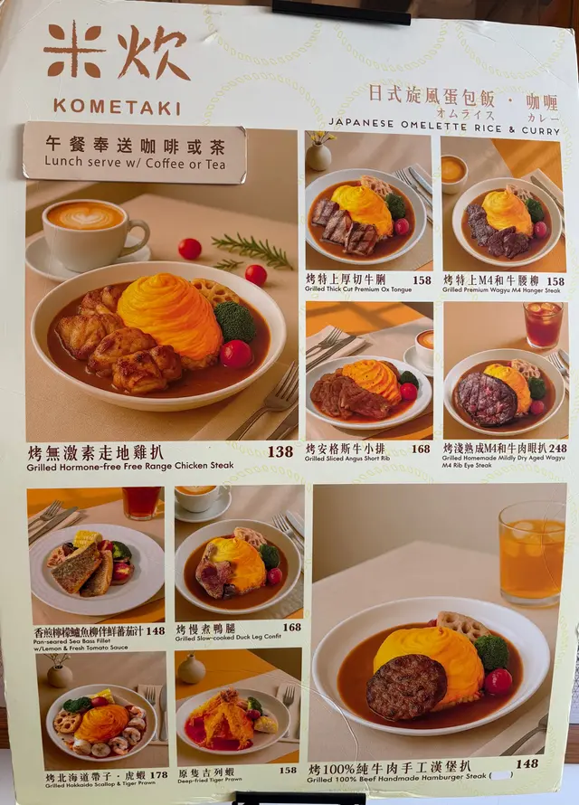 經常路過,一直覺得廣告圖好吸引環境都乾乾淨淨,都多人幫襯,諗住無伏假日特意去試試老實話味道正常,用料一般,吃不出特別之處呢個收費確實貴,CP值唔高回頭率實在不高蛋是嫩滑,但不是特別濃厚牛肉不是和牛質素米隻是夢美人,確實比泰國香米好食唯一有趣的地方是可自選醬汁:中辛咖喱、蘋果燒汁、蕃茄汁、奶油蘑菇汁烤100%純牛肉手工漢堡扒,$148肉質比較結實美國安格斯牛小排伴炸蝦2隻,$168牛肉好薄,只有很少男人胃口較大,不夠飽