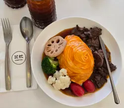 今日試咗間走高檔健康路線嘅和風料理,主打改良版蛋包飯。賣相精緻到唔捨得落匙,淡黃色嘅蛋皮泛住啞光,似係用咗日本蘭王蛋嚟炒,嫩滑得嚟帶半流心效果😍。主角靚牛切件 脂香滲透每粒米飯,但刻意減咗油分,食落唔會膩喉。特別欣賞佢哋嘅醬汁——以蘋果代替味淋熬製,溝入蔬菜高湯,甜度柔和又有層次。旁邊配搭嘅蓮藕同時令雜菜,爽脆清新正好平衡肉感。雖然索價二百幾三百蚊碗有啲肉赤,但由食材配搭到烹調心思都感受到養生哲學,偶爾獎勵自己都算值回票價。