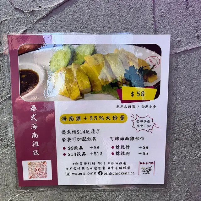 今日嘅午餐就揀咗間「粉紅色水門雞飯」出名嘅地方試吓。一入到店,嗅到嗰陣香味真係即刻餓咗,店裡面陣陣泰式香料嘅香味四溢,要點菜時我興奮到手都震😄。我點咗招牌水門雞飯,雞肉擺喺油亮亮嘅飯面頭,看起來超吸引!食嘅時候,先係雞肉,外皮烤得啱啱好,肉質嘅嫩滑同啖啖肉嘅口感真係撩撥到我嘅味蕾。伴隨嘅油飯,每粒飯都鬆軟得嚟油香四溢,根本停唔到口!佢哋嘅特製醬汁更加係錦上添花,酸酸地、微微辣味,一郁片雞,一啖飯,幾滑口👍🤤。而加嘅雞軟骨炸得香脆,椒鹽味恰到好處,啲脆感同雞味巧妙地結合,令我欲罷不能!泰式奶茶我覺得得閒仲要再試,牛奶同茶嘅味道拼合得天衣無縫,不過今次無晒,我下次會郁早少少😅。總括,「粉紅色水門雞飯」係一個味道正、地道又唔會肉貴嘅地方,食過之後真係心滿意足,仲會掛住嚟翻幾次!👌✨💯…查看更多