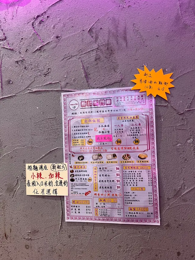 冇錯 史努比又嚟介紹觀塘平靚正之選🤪人均唔使$50就有好西食!觀塘返工返學嘅朋友真系啱晒~佢哋嘅招牌飯餐$46就有交易 仲有湯送😚史努比就揀咗佢哋最人氣嘅水門雞飯🤭👍🏿粉紅水門雞飯(配油飯) $46水門雞其實即系海南雞份量幾足 就算唔嗌增量餐其實雞嘅份量都唔少😚調味適中 食得出淡淡嘅鹹香😆唔會完全冇味連雞胸肉都夠嫩滑 一啲都唔柴髀位就更加唔使講 滑嘟嘟仲有啲啫喱🤤醬料唔系平時食開海南雞嘅三色醬而系用咗一款酸酸辣辣嘅泰式醬汁令個雞更惹味 食落酸酸地更加開胃😆配搭嘅油飯味道香濃 又唔會覺得好油膩👍🏿美中不足嘅系飯煮得淋咗啲 如果乾身啲就好啦😛味道: 8/10👍🏿冬瓜雞湯(跟set)個湯夠清 唔會話好多油浮喺面飲到淡淡雞嘅鮮甜味仲有幾舊冬瓜成個湯清甜唔假👍🏿味道: 7/10性價比: 9/10👍🏿牛三寶船麵 $52呢個set同樣都送雞湯😆史努比首次食船麵🙈感覺有啲似薯粉 不過比薯粉更加煙韌有咬口掛湯能力強 令船麵索盡湯底嘅精華味道濃郁 不過都頗辣😛但辣得嚟幾香 絕對唔魕火死辣嗰種~牛三寶分別系牛筋、肥牛片同埋牛舌同樣都系非要惹味牛筋充滿骨膠原嘅感覺 淋得嚟keep到啲嚼口😚肥牛片就略嫌鞋咗啲 未夠嫩口牛舌就好夠淋🤪味道: 8.5/10性價比: 8/10*不設加一服務費*呢個價錢 呢個質素 史努比大推😚見到仲有好多小食都好抵🙈不過食唔落咁多下次再試!😎.整體評分:味道: 8/10環境: 7/10服務: 7.5/10衛生: 7.5/10抵食: 8.5/10回頭率: 8/10-…查看更多