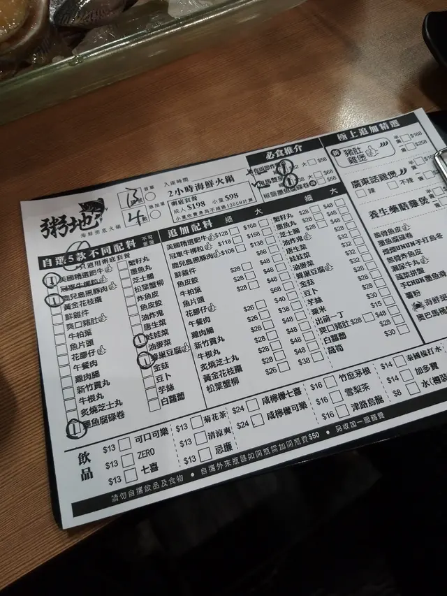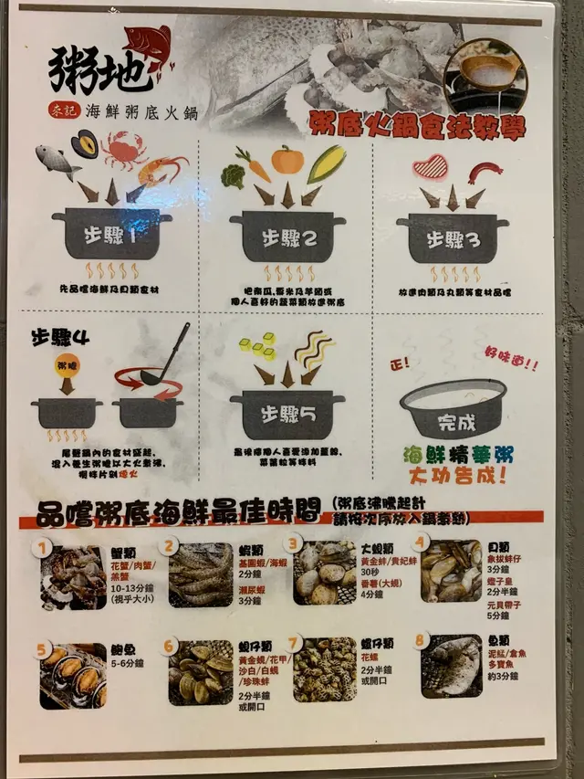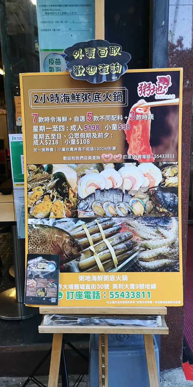 主打海鮮粥底火鍋套餐。套餐海鮮豐富,有齊蟹、鮑魚、蝦、蜆、魚等,而且海鮮新鮮生猛。客人可先享用海鮮,再吃火鍋配料,然後加飯熬成粥,味道鮮甜。