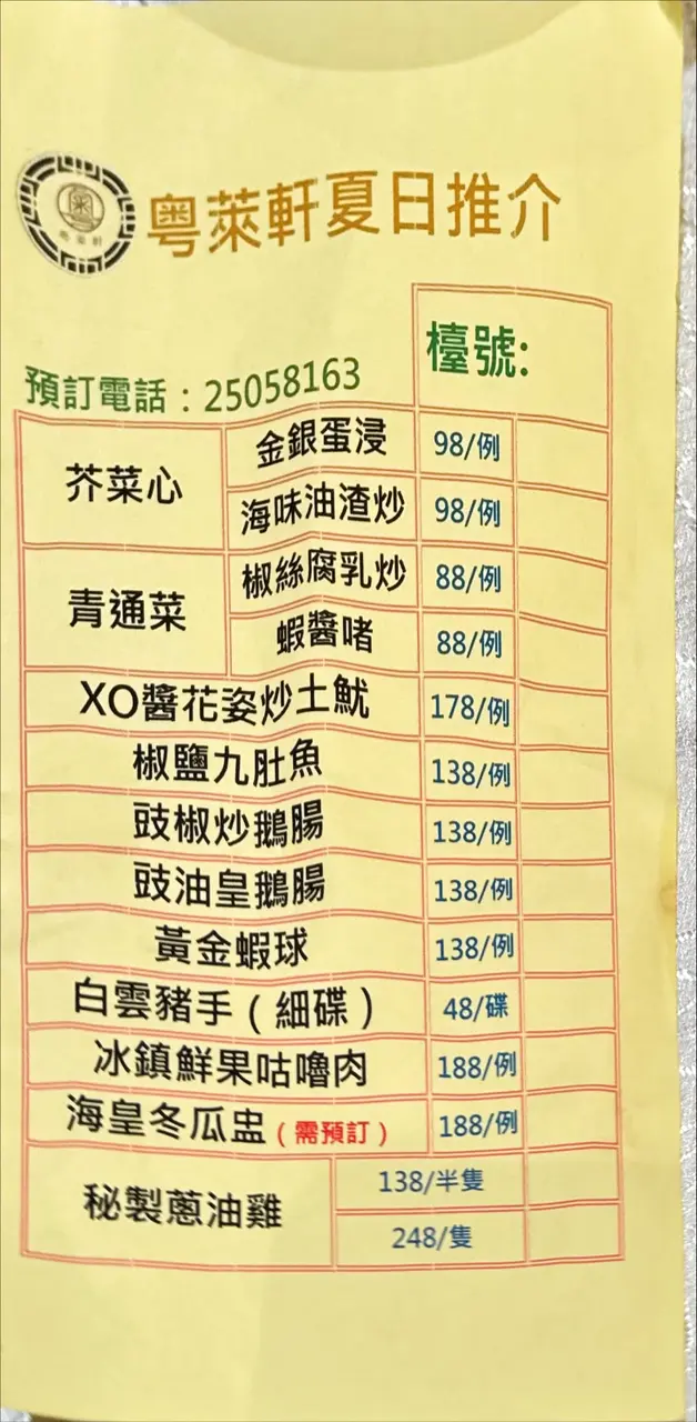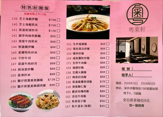 粵萊軒 (深水埗) 網址: https://s.openrice.com/QrbS0qbmB00 地址: 香港深水埗醫局街198號嘉裕居地下4及5號舖 電話: +852 25058163