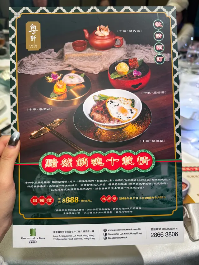 粵軒中菜廳的招牌「黯然銷魂飯」已經有10年歷史,自推出以來,原來已經售出超過兩萬碗,一直好多客人喜歡包括我,而家有口福啦,餐廳特別慶祝十年美味盛事,推出「黯然銷魂十載情」限定套餐,以四道粵式美饌重現經典風味,套餐有燉湯、點心、黯然叉燒飯和甜品,份量恰當,非常之抵食👍✨黯然銷魂十載情回饋價只需 $ 388 (兩位起)套餐已經包埋茶芥同小食《十載•功夫湯》|五指毛桃燉雞,用清燉方法,湯頭濃郁清甜,天氣凍特別感覺滋潤《十載•粵點心》 |有懷舊嘅「六姐粉果」(源自舊日家廚六姐手藝)和大大粒鮑魚嘅「鮑魚燒賣」,一次過可以品嚐到兩種即蒸經典點心!《十載•銷魂飯》|黯然銷魂飯,全晚最期待,叉燒兩大件厚切,肥瘦適中的梅頭肉燒至焦香,口感彈牙鬆軟,配上燶邊流心蛋、燒豬油和馳名頤和園御品醬油,撈上一口白飯,簡直係人間美味《十載•慶甜圓》|抹茶煎堆仔外層酥脆,包住熱辣辣嘅抹茶餡,紅豆桂花糕味道清甜,重拾經典美味✨快啲約埋班老友記、家人一齊嚟懷緬吓啦!溫馨提示:記得要預約!…查看更多