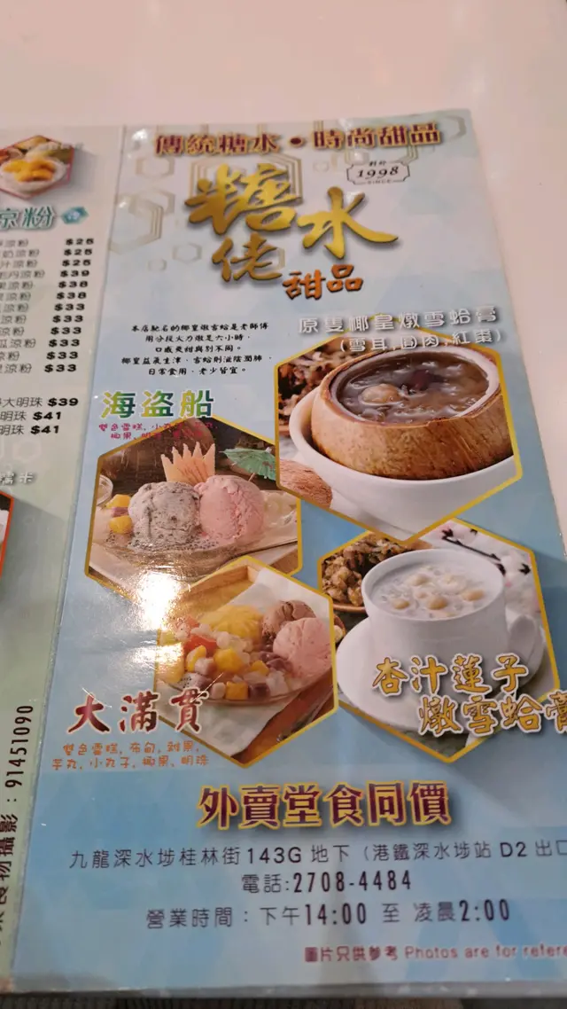 今晚第一次去深水埗桂林街的糖水佬甜品食糖水,看見評語都不錯,諗住去嘗試一下。我叫了他們標榜必食的星洲喳喳,我的兒子叫了合桃露怎不知,星洲喳喳好甜,那麼我就要求要一杯熱水,諗住自己加熱水後可以減低甜度,竟然他們說廚房沒有熱水,吹脹!最後因為太甜,我真係不能食下去了。服務員只說糖水當然係甜啦。(我心中諗,咁我俾杯熱水加啲白砂糖俾你飲,你都可以講佢係糖水啦,吹脹。)我的兒子合桃露,外貌不錯,內裏希得像似水,擺明就係材料不足啦!真的很失望!