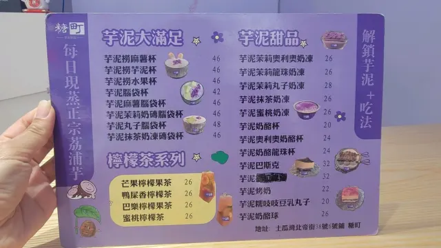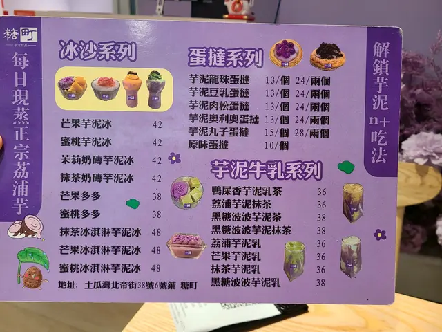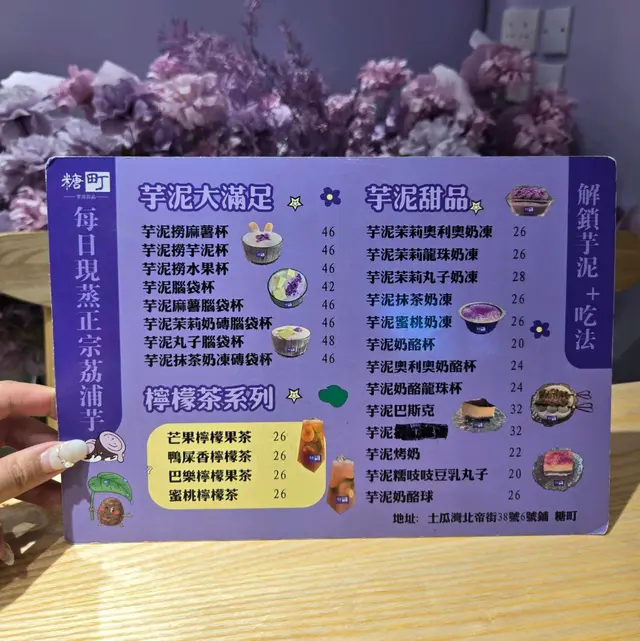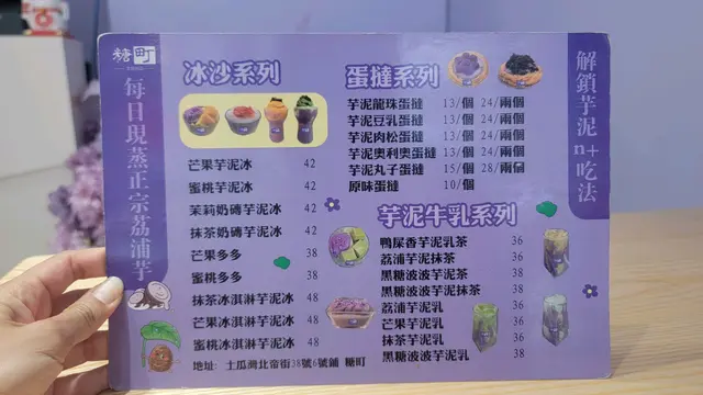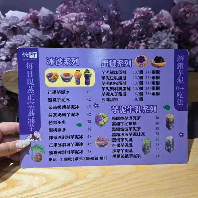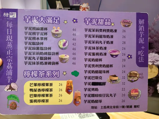 以芋泥主打的甜品店真的不多朋友專程嚟土瓜灣就係為咗食佢價錢由30零至40幾蚊左右有大量芋泥/芋圓甜品仲有大熱的鴨屎香檸檬茶和手抓餅性價比高又幾好食芋泥麻薯腦袋杯完全係俾個名吸引到!芋泥好濃郁,加上煙煙韌韌嘅麻薯,仲有奶凍,成件事都好夾,真係特別滿足朱古力綿綿冰難得朱古力味唔會太甜,份量比起平時的綿綿冰更大方,加上口感彈的小丸子和朱古力脆脆波幾有誠意,除咗食芋圓之外都係一個好選擇!📍土瓜灣北帝街38號地下6號舖…查看更多