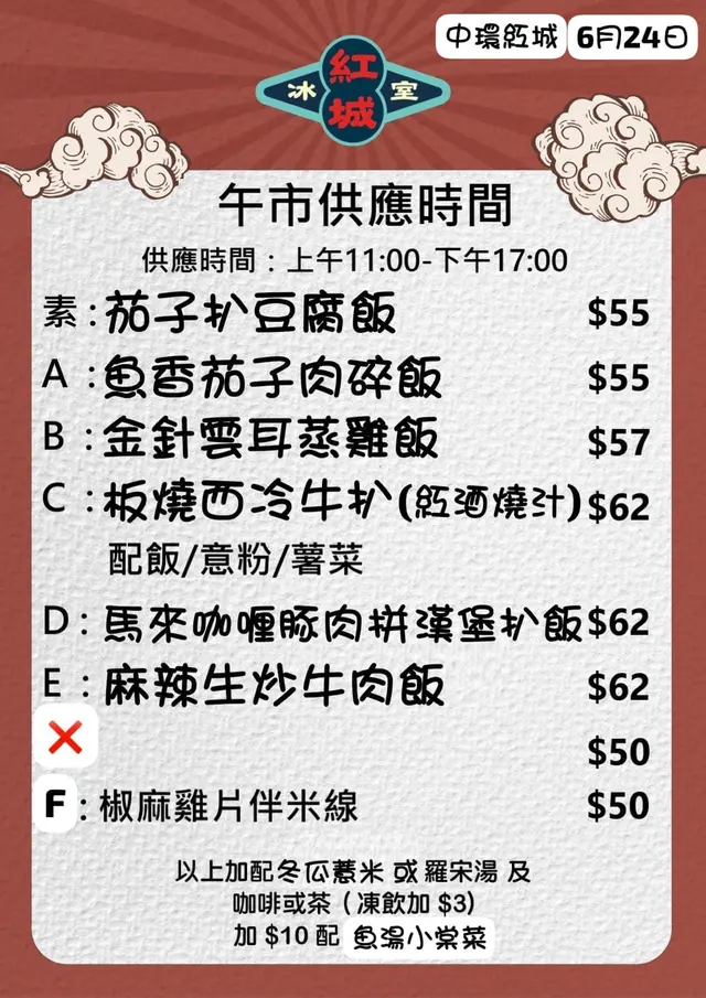 紅城冰室 (中環) 網址: https://s.openrice.com/QrbS0rVS800 地址: 香港中環機利文新街26-28號地舖 電話: +852 27265088