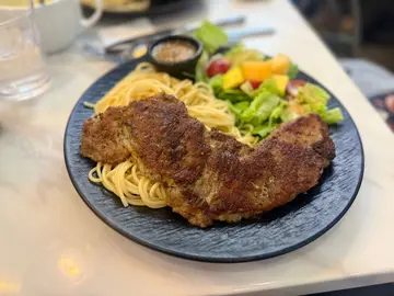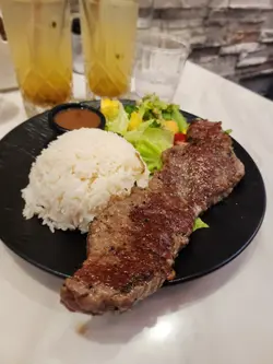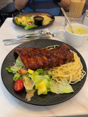 ✦ 去骨海南雞配香雞油飯 $68價錢親民非常抵吃的海南雞飯去骨海南雞近雞腿的位置挺嫩可是近雞胸的位置就相對結實配搭香口的油飯、餐湯和餐飲Affordable 𝐁𝐨𝐧𝐞𝐥𝐞𝐬𝐬 𝐇𝐚𝐢𝐧𝐚𝐧 𝐂𝐡𝐢𝐜𝐤𝐞𝐧 𝐑𝐢𝐜𝐞 is a steal! The boneless chicken thigh is quite tender, though the breast part is a bit firmer🐥 Paired with fragrant rice, a comforting soup, and a refreshing drink, it’s a perfect meal🍚✦ 香煎西冷牛扒沙律菜配意粉 $85 選了燒汁和意粉搭配西冷牛扒西冷牛扒外層焦香內裏挺嫩滑而且意粉份量頗多適合男士吃套餐加了$10改配經典紅豆冰Opted for the sirloin steak with a rich sauce and spaghetti on the side🍝 The sirloin is perfectly seared on the outside, tender and juicy within🥩 The spaghetti portion is generous, ideal for guys with big appetites✨ Upgraded the set for just $10 to include a classic red bean ice drink, quite good🫘————————————————————————————紅橋 (太子)太子花園街230號地舖…查看更多