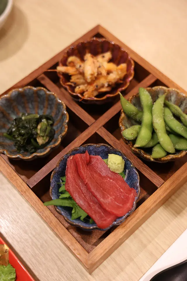 是晚接男友收工,起佢公司附近拍拖拖食飯佢同事介紹一間又可以滿足佢同我嘅餐廳我喜愛抹茶,他喜愛魚生日本野位於尖東帝國中心上一層的紅葉茶屋, 主打和式食物內裡都幾大, 載客量都幾多平日夜上嚟講都多客出出入入, 我見好多女士係專程嚟食甜品添餐廳用咗好多熊貓公仔佈置, 好可愛而我地最鐘意就係有set叫set, 有個二人前包含有我同男友喜愛的食物~前菜包括: 紅葉四點盛 (炸小蝦, 枝豆, 刺身3點和味噌八爪魚) 和龍蝦沙律加$48轉咗迷你角切魚生飯樣樣都非常精緻, 仲要上菜有效率! 但又唔係凍冰冰~檯上面多咗個熊貓燈, 打起卡嚟特別可愛又唔單調呢個炸蝦仔好好食, 連蝦頭蝦殼都可以食埋, 送酒一流 (餐廳有酒牌, 見有個MENU係朝日啤買一送一添)刺身三點有吞拿魚, 三文魚和帶子, 雖然是普通貨色, 但全部都新鮮也不是單薄的厚度主食我一早就睇中咗: 紅葉蟹味噌伴麵個麵入面已經有蟹膏同蟹肉拌過, 另外仲奉上沒拌過的2小碟, 真係好足料麵條份量又多, 帶點暖, 但又唔會煮到稔哂, 無反悔揀呢個主食男友就揀咗: 吉列豬扒及廣島蠔定食, 呢份係正正常常, 豬扒都是厚切, 同蠔都唔會炸到乾柴見有個三文魚他他芝士脆片都只係加$20, 男友話好想試下雖然上層已經有三文魚同埋香料嘅味道, 但也不減芝士脆片的芝士香濃味道, 真係超濃甜品方面都很精緻, 六選二(有些是要加錢的)我地揀咗: 抹茶提拉米蘇和抹茶白玉漬平時食開係咖啡味嘅提拉米蘇, 抹茶味就係第一次用上木盒盛裝著, 超日式和風, 好似去咗日本咁面頭佈滿抹茶粉, 層層有序, 甜品本身的甜度不高, 也有抹茶粉中和了甜度內裡的忌廉細滑, 但又唔會好漏另一份是抹茶白玉漬和紅豆茸, 配埋一杯超濃抹茶和黑糖漿丸子是沒甜味的, 它就像平日吃的湯圓軟軟糯糯, 只是內裡沒有餡料, 那個餡料(紅豆茸)就隨自己喜好配搭, 又或者只配黑糖漿也可呢份甜品都值得推介, 不過每人食3粒都會幾飽下, SIZE都似平時嘅湯圓咁大粒有白有綠, 又加了點橙色(似是紅蘿蔔), 打卡一流鐘意熊貓, 鐘意抹茶, 鐘意日系呢度真係一次過滿足幾個願望而且餐廳地方夠寬敞, 空間感大, 唔會覺得好嘈, 聚飯好地方…查看更多