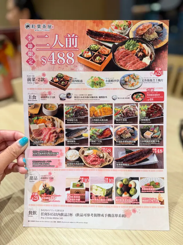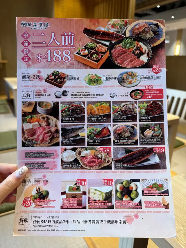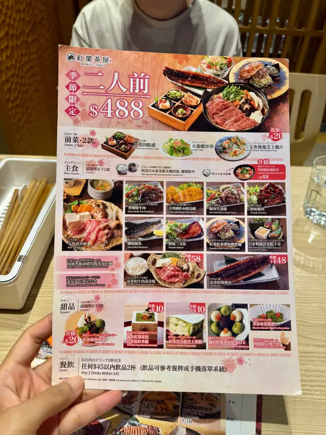 荃灣紅葉茶屋的二人前套餐絕對是高質素的日式料理。餐前的龍蝦沙律清爽開胃,龍蝦肉鮮甜彈牙,配上沙律醬汁恰到好處。海鮮刺身四點成入,包括吞拿魚、三文魚等,切片厚薄適中,魚味鮮美,配上日本米飯和麵豉湯,簡單卻令人滿足。我們加了 $58 升級成豪華和牛壽喜燒,絕對值得。和牛油脂分佈均勻,入口即化,配上壽喜燒醬汁和蔬菜,香氣撲鼻,令人回味。另外,油漬赤蝦手卷也令人驚喜,蝦肉鮮甜,油漬處理令味道更有層次。飲品方面,雪糕白玉抹茶Latte香濃滑順,白玉煙韌,甜度適中,而謙倉紅葉茶屋抹茶則茶味濃郁,適合喜歡原味抹茶的朋友。甜品方面,黑蜜抹茶蕨餅口感柔軟,黑蜜香甜不膩; 抹茶 Tiramisu則是西式甜品的點睛之筆,口感細膩,與整體日式餐點形成有趣對比。整體而言,紅葉茶屋的餐點不但味道出色,擺盤亦見心思,服務親切,是一次愉快的用餐體驗。適合情侶、朋友或家庭聚餐,值得再訪。…查看更多