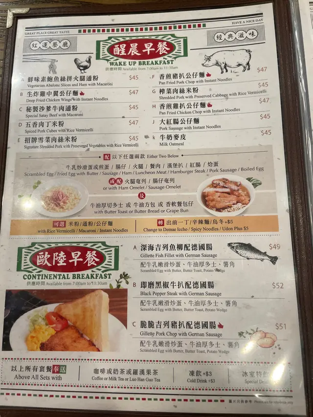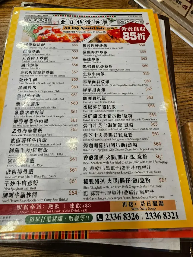 农历新年期间香港大部分餐饮休假,差点饿死在街头。在太子附近发现这家茶餐厅在营业,就近吃个碟头饭。🪴环境:金满楼的隔壁。店面宽敞明亮,装修年轻化,布置一般,通道上堆放了很多杂物。卡座多,晚饭时间去的,很多街坊在这里就餐。🍛椒盐猪扒饭:点菜时,菜单上标注的特色碟头饭。结果不是现做的,应该是提前做好,保温状态,几分钟就出餐了。猪扒肉质非常柴,一股偏咸的腌制味,没有一丝肉香脂香。肉量足,但真的很难吃,我勉强吃完一块就放弃了,是那种咽下去都想去洗胃的劣质,基本全浪费。随餐点了冻饮,冻柠茶少冰,口感还不错。街头快餐,价格适中,一份碟头饭加冻饮58港币。💁🏻♀️服务:店员态度热情,饮品出餐较慢,等了一会儿..随餐有送例汤,节假日没加收服务费。📍香港特别行政区油尖旺区太子弥敦道789号健峰保险大厦地下2A.…查看更多