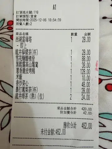 今晚同朋友去屯門市廣場行街,經過一間叫做綠茶嘅餐廳,聽講係米芝蓮星級名廚俞斌聯手合作訂製嘅餐牌,同埋佢哋有推出會員app 㗎同埋仲有迎新優惠添,佢哋餐廳仲有唔少嘅套餐可以提供😍餐廳提供嘅茶仲好好飲添😍係茶底好濃郁嘅綠茶🍵蔥香脆皮烤鴨$128烤鴨肉質鮮嫩啲肉唔會嚡熠熠每一啖都充滿鴨嘅香味😋雪花糖醋裡脊$88酸酸甜甜好開胃,肥瘦均勻,用嚟送飯真係一流食過返尋味😍香炒菜心$48平時最唔鍾意食菜嘅我都忍唔住食咗好多條,菜心勁鮮甜炒得好香😝黑髮露高山蘿蔔$38同手臂💪一樣粗嘅蘿蔔,大大條,勁多汁😍佢嘅醬汁係充滿黑松露嘅香味超級正西湖雷峰塔$28係好香奶味嘅奶凍,形狀係一個雷峰塔😍打卡一流,價錢相宜,值得一試😇龍井檸檬茶$28佢嘅冰係熊仔嘅形狀非常得意,檸檬茶底好香又唔會太甜暴打鳳梨茶$28鳳梨味好香,有少少酸味中和咗甜味,好解膩綠茶餐廳 (V City) (屯門)屯門屯門鄉事會路83號V City MTR樓M-82號舖…查看更多