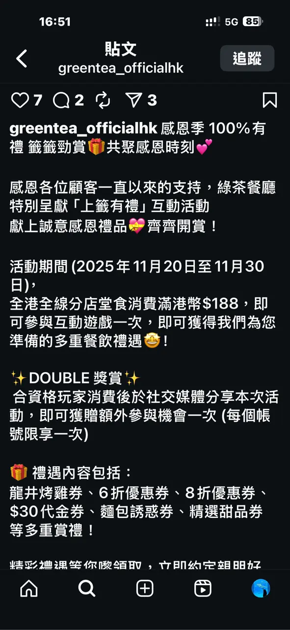 今晚同朋友去屯門市廣場行街,經過一間叫做綠茶嘅餐廳,聽講係米芝蓮星級名廚俞斌聯手合作訂製嘅餐牌,同埋佢哋有推出會員app 㗎同埋仲有迎新優惠添,佢哋餐廳仲有唔少嘅套餐可以提供😍餐廳提供嘅茶仲好好飲添😍係茶底好濃郁嘅綠茶🍵蔥香脆皮烤鴨$128烤鴨肉質鮮嫩啲肉唔會嚡熠熠每一啖都充滿鴨嘅香味😋雪花糖醋裡脊$88酸酸甜甜好開胃,肥瘦均勻,用嚟送飯真係一流食過返尋味😍香炒菜心$48平時最唔鍾意食菜嘅我都忍唔住食咗好多條,菜心勁鮮甜炒得好香😝黑髮露高山蘿蔔$38同手臂💪一樣粗嘅蘿蔔,大大條,勁多汁😍佢嘅醬汁係充滿黑松露嘅香味超級正西湖雷峰塔$28係好香奶味嘅奶凍,形狀係一個雷峰塔😍打卡一流,價錢相宜,值得一試😇龍井檸檬茶$28佢嘅冰係熊仔嘅形狀非常得意,檸檬茶底好香又唔會太甜暴打鳳梨茶$28鳳梨味好香,有少少酸味中和咗甜味,好解膩綠茶餐廳 (V City) (屯門)屯門屯門鄉事會路83號V City MTR樓M-82號舖…查看更多