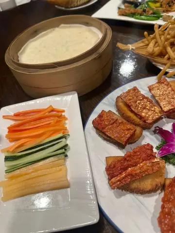 放工同班friend去尖沙咀緻素坊食晚餐,地點唔算就腳,行到去都出汗💦。入到去環境幾闊落,但燈光暗啲,感覺有啲似高級版茶樓🍵。蘿蔔絲酥餅外皮鬆化到癲,一咬落去「沙」一聲碎晒,入面蘿蔔絲清甜冇渣,仲要夠熱辣辣,正過唔少酒樓!黑松露野菌餃皮薄到透光,一啖咬落去黑松露味爆出嚟,仲有啲菇粒彈牙嘅口感,素食做到咁濃味真係有驚喜👏鬼馬炒雙蔬個名已經贏晒,其實係炸芋絲同埋唔知咩蔬菜炒埋一碟,脆卜卜又夠鑊氣,送飯一流,不過食多兩啖開始覺得油膩,要飲啖茶沖沖🫖整體食物質素中上,但價錢就進取啲,人均$250左右。最抵讚係佢哋用新鮮食材,唔會死咸,不過服務就真係要改善吓,明明唔滿座都趕頭趕命咁,想傾多陣計都好似阻住地球轉咁🌍⋯今時今日咁嘅服務態度,真係抵港人北上消費㗎!…查看更多