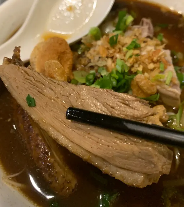 環境比起泰式風情,更令我覺得陀地。menu唔多,價錢亦令我好surprise,呢個地段竟然都做到接近街坊價(後來發覺同份量有關)豬肉什錦湯河雖然俾朋友warn過size,但上菜時都係一shock,真係冇見過用咁迷你同扁嘅碗裝湯河。講返味道,豬肉切成一塊塊有啲厚度,咬落仲係爽口,一啲肥肉都冇,又唔'hai',非常唔錯。湯底夠濃,粉煮得岩岩好