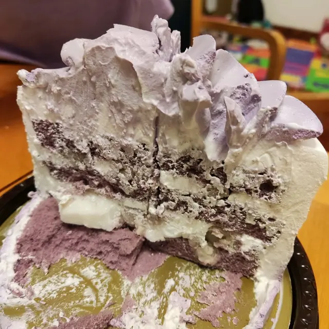 屋企人生日,見仲有兩張餅卷未用,所以去美心睇吓有咩蛋糕好買。見到哩個紫色嘅芋頭麻糬蛋糕賣$148,外型都幾靚就買左啦。蛋糕切開裏面有兩層芋頭cream,有大大片麻糬,外面包住原味cream,雖然偏甜,但係都幾好食。推介俾其他人試下。…Read More