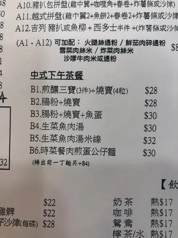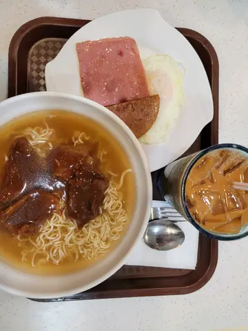 今朝去咗火炭做嘢, 行去目的地途中,見到呢間餐廳,都幾多人食緊,咁就入去試下。餐廳都幾舊式,先買票,後憑收據拿食物。食物就大件夾抵食。點了沙嗲牛肉公仔麵配火腿餐肉太陽蛋,公仔麵都係茶記專用大光麵,沙嗲味夠但可以再濃味少少。其他配料都係正常發揮。杯凍奶茶就不過不失,如果茶味多丁點會更好。