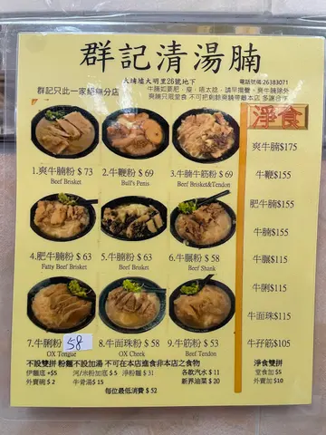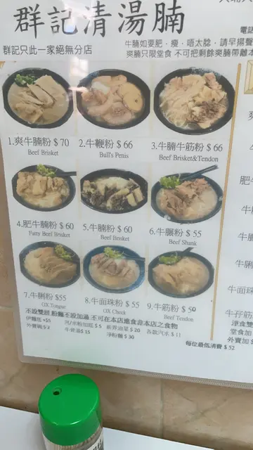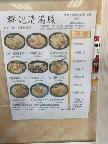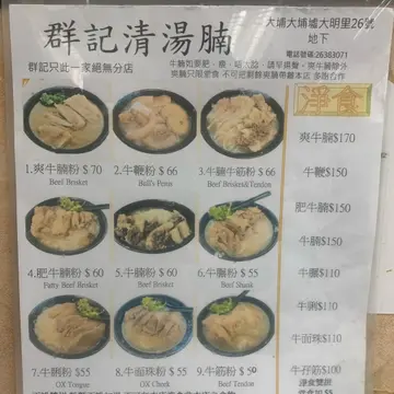 「別人笑我太瘋癲、我笑他人看不穿」之大埔群記清湯腩: 好多人都會覺得麻麻哋姐、N年前好食啲, 牛腩好柴這這那那,喺我心目中永遠係香港牛腩麵頭三甲、知道佢光榮結業、排粒半鐘都要會一會佢、掛住嘅唔只係佢嘅味道 、我嘅回憶、更重要嘅係老闆娘嘅人情味。 入到去有位面目全非嘅阿姐同我講冇淨爽,感覺就好似破壞之王大師兄用邊鎚兜嘢中落我塊面度Knock Down , 點知突然之間有把倩女幽魂嘅聲音同嗰個阿姐講,「得㗎喇你照寫啦」、 上到枱就係爽腩、同老闆娘嗰種微妙嘅關係不能用筆墨形容。 呢度嘅爽腩有樣好:佢唔會好似九記咁要有暗號先叫到、又或者叫到佢都溝啲唔知乜嘢嘅部位俾你、反之群記真係比足料你,每件有返咁上下斤両、我個攻略位就係:爽腩必須要淨食,如果有粉面的話、佢會將爽腩完整一大舊切細,咁樣真係會影響到嗰碗粉嘅質素,所以我相信如果叫淨食的話、怨氣應該不會太重😊老婆得一個,趁有機會三妻四妾,梗係叫一碗淨爽、筋河、面珠E, 男人的浪漫、大家明嗎「笑」營業到4月29號就結束,下星期再接再厲…查看更多