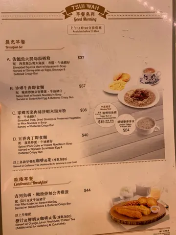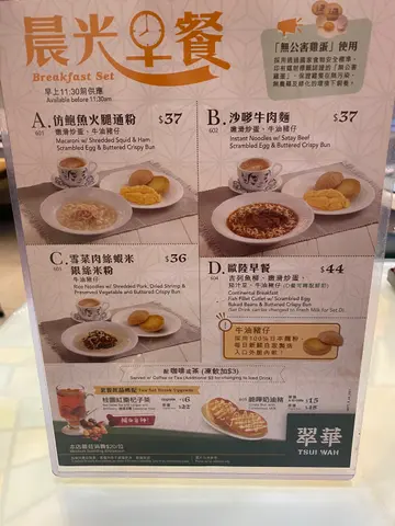 自從港鐵成日改營運時間之後都習慣咗回去搭巴士巴士同港鐵最大嘅分別就係要早好多好多好多出門口只可以保證會遲到但由於路面嘅交通情況實在太難掌握經常都會出現在我早左好多嘅情況變相就會多咗好多坐定定食早餐嘅機會🤣🤣正所謂翠華同7–11一樣,仲有兩間喺附近單單荃灣區都有兩間今次食香港人嘅最愛沙嗲牛肉公仔麵加個櫻花蝦炒蛋同多士先講沙爹牛麵個公仔麵非常林,拎出嚟仲要唔係好熱好明顯一早煮好晒個櫻花蝦炒蛋一模一樣都係唔熱,無蛋香最熱就係杯熱咖啡,但都係冇乜香味總結:食物水準比之前食下跌咗好多好明顯好多嘢都係整定,唔新鮮啲侍應掛住傾計都唔會去做服service