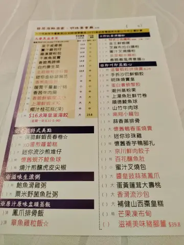 大夥聚餐,友人提議到此酒家,因為菜式甚有特色。當日聚會有獨立房間,私隱性良好,亦令大夥的互動更自由。餐單由友人與酒家共議,當中包含了不少酒家的招牌菜式。💢香草焗手剪脆皮乳豬對頭盤的乳豬寄予厚望,乳豬明顯是一隻十分年幼的小豬,皮薄脆之餘,皮下脂肪亦不多,但乳豬實在醃得過鹹,鹹味完全蓋過乳豬的肉味,香草的味道雖然也突出,但無補於事,是吃過最鹹的乳豬。💢 XO蘭花帶子海中寶海中寶包含多種海產,可是鮮度一般,而且炒得有點過火,西蘭花倒是清爽,成了菜式的主角。💢冰火香芒蝦多士菜式的最大賣點是添加在蝦多士之上的香芒雪葩,朋友們對此創意有讚有彈,個人認為香芒雪葩冰凍酸甜,是中和鹹味的好點子。💢椒鹽南非五頭鮑魚鮑魚打正旗號以椒鹽炮製,反而味道剛好,鮑魚口感柔軟,是當晚的亮點。💢即磨杏汁菜膽燉白肺湯白肺湯的湯底十分濃稠,湯味濃郁,然而明顯不是杏汁單獨所造成,而是加入了疑似腐竹的食材,以鴛鴦食材創作湯底也可說是創新。💢雲吞浸游水大海斑雲吞浸海斑的組合創新,雲吞外型飽滿,搭配浸熟的斑魚片同吃,魚鮮與肉香互相輝映。💢碧綠蠔皇鮑螺片一向不喜歡鮑螺片,因此沒有嘗試,撇走醬汁的生菜倒是吃了幾口,油潤爽口。💢當紅脆皮炸子雞炸子雞皮脆肉也不乾柴,但問題也是在於過鹹,結果剩下不少雞件,無人問津。💢鮮蝦太極鴛鴦飯一向比較喜歡白汁的太極飯,但這次卻選擇了紅汁鴛鴦飯,因為以蕃茄為主料的紅汁味道酸甜,而白汁也因為過鹹而不得大夥歡心。💢迷你流沙煎堆仔 / 宮廷鴛鴦糕煎堆仔和鴛鴦糕都是水準之作,餐後的一點甜亦減少了這頓重口味圍菜的缺口。…查看更多