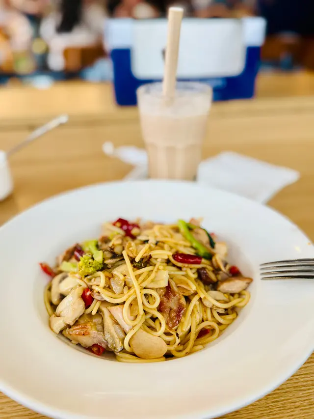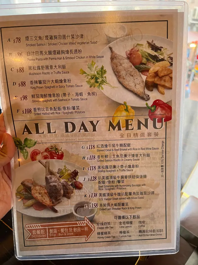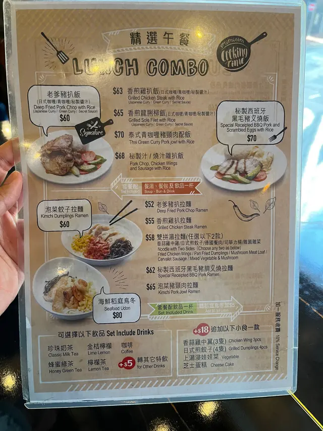 8點鐘夜晚搵飯醫肚,行過見到餐牌ok就上去食。平日8點幾,餐廳得2成入座率,我哋都求醫肚無所謂。用qr code手機落單,套餐有野飲。裝修都有投入資源,食物性價比好,平均70就一個套餐,相信係打工仔飯堂好地方。青咖哩豬頸肉意粉,夠飽肚,意粉就一般嗰啲粗身意粉質地,豬頸肉都煎得夠香。龍利柳燒汁意粉,魚肉都煎得夠香,味道唔會有太雪藏味。餐肉蕃茄直通粉,厚切餐肉夠過癮,味道酸甜夠平均,通粉掛汁唔會太乾身。