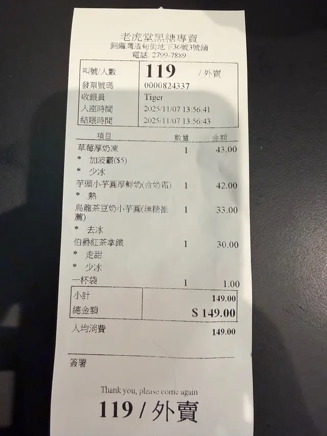 今天就是要一嘗珍珠紅茶厚拿鐵! 來自台灣的老虎堂黑糖專売,憑藉「虎紋掛壁」的黑糖珍珠鮮奶紅遍港台,這次來到銅鑼灣分店,決定試試他們的另一飲品——珍珠紅茶厚拿鐵,看看是否真的能重現台灣夜市那種讓人上癮的甜蜜滋味~ 🔸 珍珠紅茶厚拿鐵|含奶霜 ⚡️ 好味指數:★★★★☆ (4/5) 🧀️ 卡路里:約450kcal/杯 💰 價格:HKD 38 👉 香氣:打開杯蓋後,濃郁的黑糖焦香撲鼻而來,混合著紅茶的醇厚和奶霜的甜膩,瞬間勾起台灣夜市的回憶🌃~ 👉 珍珠:✅ 絕對是亮點!珍珠煮得恰到好處,外層Q彈,中心軟糯,黑糖蜜漬得入味,每一顆都充滿焦糖香氣,咬下去還會爆出微甜的糖漿💥。 👉 紅茶底:茶味濃郁但不苦澀,帶有微微的麥香,和黑糖的甜味平衡得剛好,不會像某些品牌甜到喉嚨發膩。 👉 個人回憶:這杯讓我想起在台北士林夜市,邊走邊喝老虎堂的幸福感——雖然價格貴了點,但味道確實有8成相似! 奶霜稍微偏甜,建議攪拌後再喝,否則最後幾口可能會有點膩😅。 🌟 總評 (75/100) ✅ 優點:珍珠水準超高,紅茶底濃郁🍯。 ⭕ 注意:奶霜偏甜,不愛甜的朋友可以選擇「少奶霜」或「微糖」。 🙆♀️ 小建議:一定要搖勻再喝,讓珍珠, 紅茶和奶霜完美融合,每一口都是濃郁的甜蜜暴擊!🐯💖