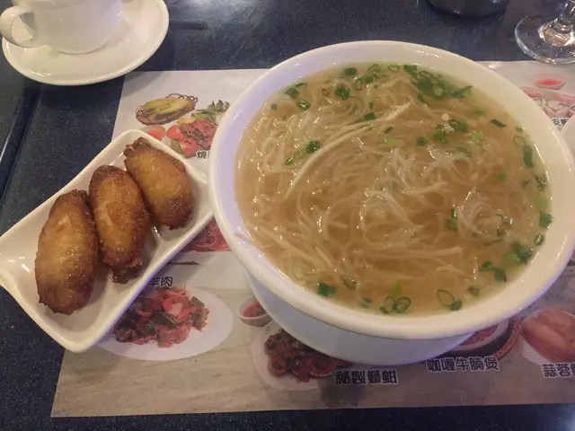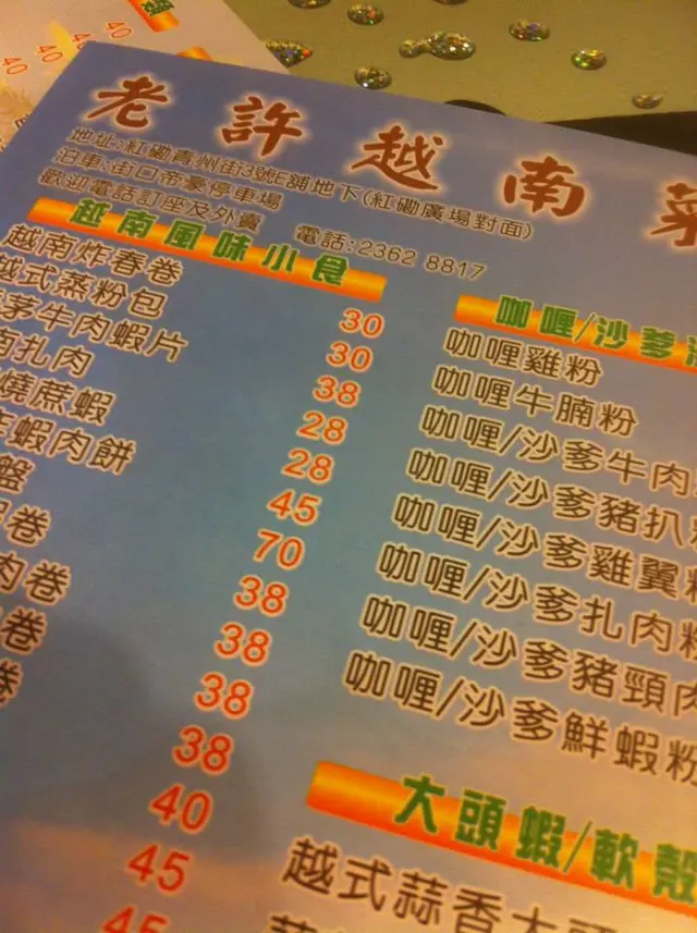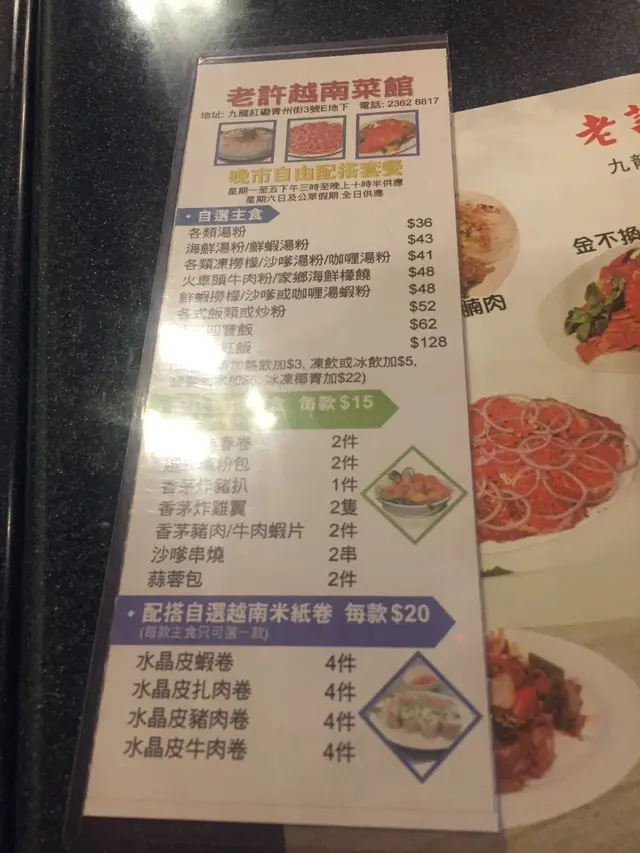 體諒同事一個人食 lunch 悶悶不落,等我陪您食啦。見個二人餐似乎幾抵食咁喎,每人一個碗湯河加兩個小食一碟菜,百幾蚊幾好噃。同事一直覺得係老趙,我已講多次係老許,大家黎到終於水落石出喇。第一次黎當然要望真個 menu,菜色花款多樣化,起碼比一般越河食肆為多,除左大路越色食物外,仲有快餐、廣東小炒、西餐,連生蠔都有。梳打青檸,咁甜既?下次要少甜之受得住。越南春卷,問清楚係邊隻先,好采係炸。唔係粉皮有芫茜芹菜那款,最怕香菜我一食就反胃。沾少少魚露再用生菜卷住食,炸得金黃鬆脆熱騰騰,味道不過不失,平凡不無特別,合格可以一試。粉包,貌似暖暖地,竟然入口熱到出煙!真係超級熱,雖食得出微波翻叮。放左入口出晒煙,吞都吞不下,呆足十幾廿秒先慢慢趙得到乍。上面鋪著札肉,餡料同春卷差不多,加上肉碎同吃好香口,估不到的美味,推介。加 $5 蚊就有的前菜,梗係加啦!本身我唔食蔥,不過炒得香口去左草腥味都食得到。隻碟好熱,微波味濃,粉皮超級燙嘴,成舊掉入口眼水都飈埋,好采無灼傷甩皮。濕濕黏黏粉皮包著肉碎,表面鋪上炸蒜青蔥粉絲札肉絲甘筍絲,外觀唔討好,但全部食材混在一起時,蠻不錯喎。生牛肉金邊粉全走,不要芫茜蔥、不要九層塔、不要芽菜,指天椒青檸另上,梗係要兩份先夠酸夠辣啦!靈魂都係靠個湯底,即時淺嚐幾口,微暖溫度還可以,湯汁味道偏淡,牛肉及香料味道薄弱,比起越棧、老趙、阿呂還要淡呢。牛肉質素就還可以,中規中矩,不太鞋不太瘦,嚥韌帶點點牛甜味。海鮮炒飯,真的嗎?驟眼望落去見唔到有海鮮呢,耐心搵一搵,見到有幾粒蟹柳同幾粒魷魚,再落力兜兩兜,驚見兩粒蝦仁,皇恩浩蕩,多謝多謝。撇除配料問題,其實個炒飯都炒得幾好,不太濕而有鑊氣,味道滋味可口,賣相就不敢苟同。蠔油白菜,如果係雞油白菜就好喇,白菜配蠔油硬係怪怪的。半生不熟,爽爽水味濃不苦澀,過得去。馬拉盞炒通菜,雖然只係旱通,但炒得鮮甜翠綠多汁又爽口無渣,好滿意。仲帶少少微辣不太油,合格!越式牛腩河全走,次次都係生牛河有點悶,專登轉下口味試試個牛腩。質感有點硬掘掘,羶味強烈,我都係食返生牛河算喇。個湯只係暖暖地,又未至於太凍,免強接受,湯底味道非常清淡。生牛肉河全走,梗係唔記得我要全走,亂七八糟仲有幾條芽菜幾粒蔥,想揀死我咩!牛肉片成卷上,一團牛肉是故意賣點嗎?外層廿十成熟,幸好裡面還是嫩紅色。嫩紅夠鬆軟,深啡就乾鞋。蘿蔔微弱的甜味,爽爽多水多汁無渣。湯頭平庸,牛骨湯淡淡然,合格無驚喜。沒有很想一飲再飲的衝動,混上指天椒青檸汁開胃多了。最喜歡幼河粉,最衰實淨沙河粉平平無奇,略略拖水,實淨不綿滑不索湯,是但連湯倒落肚算了吧。侍應叔叔哥哥們都主動熱誠,勤奮有衝,非常好。…查看更多