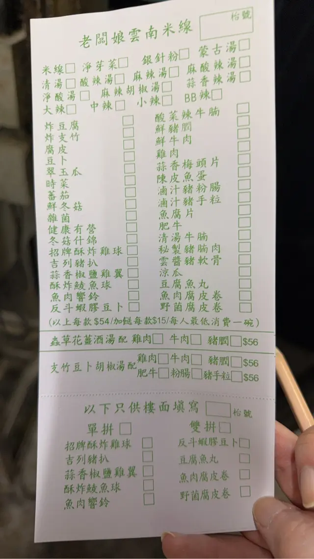 米線控朝聖,傳說中被米線耽誤嘅炸物店😂。搵咗一輪先搵到,位置幾隱蔽,我係平日下午五點開門嗰陣就到,未夠半個鐘舖頭已經坐滿,人氣真係唔講得笑。環境比想像中企理,冷氣夠,坐位唔算多但唔迫。叫咗蒙古湯大辣底米線,餸就揀咗雜菌腐皮卷同醬汁豬軟骨。炸腐皮卷睇落好多油,但神奇嘅係食落一啲都唔膩,外脆內香,層次感足,口感相當討好。豬軟骨唔係佢哋出名嘅餸,但都好出色,夠腍又入味,食落有驚喜。蒙古湯底風味獨特,有孜然嘅香味,湯底自帶肉碎同香蔥。因為湯底好濃郁同香辣,以為食完會好口渴,但結果竟然一啲都冇,呢樣好加分。總括嚟講,味道係滿足到期待值,如果唔需要排隊,一定會再食,但要排太耐嘅就未必會。…查看更多