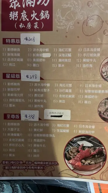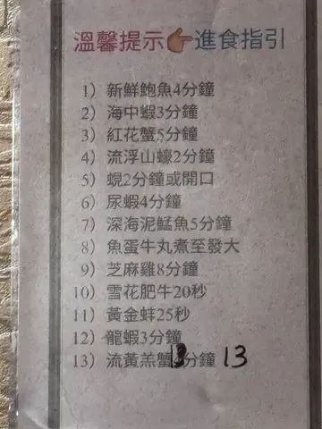 餐廳似乎只提供一種湯底,入面有粟米冬瓜非常之清淡的清湯底,近乎係冇咩味。套餐提供多種海鮮,基本上樣樣海鮮都好新鮮。肉蟹好大隻好鮮甜,鮑魚少少韌,貴妃蚌鮮甜,蝦隻都好鮮甜。由於湯底冇咩味,主要都係食返海鮮嘅原味。非海鮮方面,牛肉味道幾濃郁,雖然唔算好肥美,但係都尚算嫩滑。墨魚滑鮮甜彈牙,但牛丸同蟹籽丸就好普通。炸魚皮薄脆。最後的高潮係加啲粥落個湯底。海鮮粥味道鮮甜得來再加啲胡椒粉味幾惹味,作爲全晚最好味的結束。總結:海鮮新鮮,主要食原味。冇咩extra 或驚喜味道。環境:★★☆☆☆ 食物: ★★★☆☆ 性價比:★★★☆☆ 推介度: ★★★☆☆