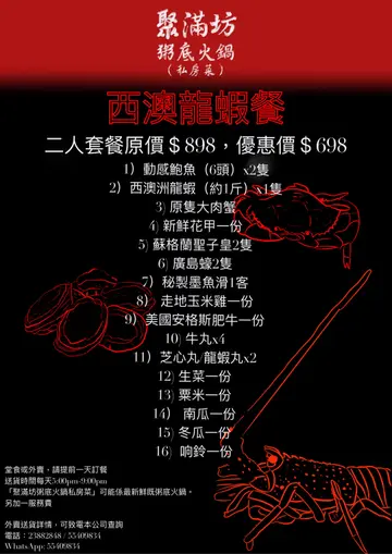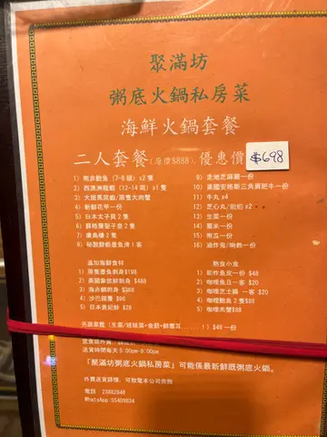 聚滿坊粥底火鍋私房菜 (太子) 網址: https://s.openrice.com/QrbS0Rou900 地址: 香港太子基隆街20號地舖 電話: +852 23882848