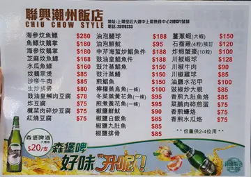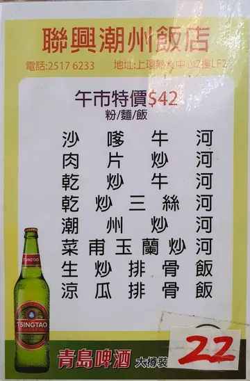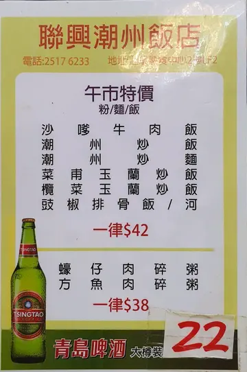 聯興潮州飯店 (上環) 網址: https://s.openrice.com/QrbS0n3G100 地址: 香港上環皇后大道中345號上環市政大廈2樓熟食中心CF2號舖 電話: +852 25176233