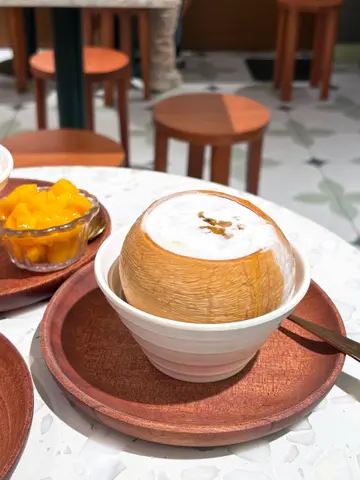 清新美味配搭特色甜品😋😋依間甜品舖,見佢比較出名係龍眼冰嘅甜品,咁當然要叫返一個試吓啦,試咗一啖之後,都覺得嚟到係值得叫嘅,口味好清新,係真嘅龍眼味,而且冰冰涼涼入口即溶,非常消暑解渴。佢冇款凍嘅甜品上面都擺咗啲脆脆珠,有多一重口感。但係識榴槤嘅朋友,我勁推薦要食佢榴槤冰嘅嘢食,我哋叫咗個榴槤黑糯米,呢個配搭好夾,除咗有味道非常濃郁嘅榴槤冰之外,仲有榴槤肉喺上面,加埋佢啲唔太甜嘅黑糯米口感豐富,榴槤愛好者必食。另外椰皇燉奶加湯圓都唔錯,但係會覺得冰嘅甜品更加係呢度嘅必食。