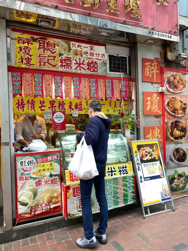 大名鼎鼎的聰記糯米糍,找了大大大半天的一個小鋪子,就是為了這個糯米糍。其實就在英皇對面,但是太小不顯眼了,錯過了一趟路白走了,第一次來真是有點難找。Size分為M、L、XL,有的有買五送一。糯米糍的話真的挺好吃,要了招牌的榴槤&芒果糯米糍,糯米皮軟糯得恰到好處,不會很粘牙,裡麵包的果肉完全真材實料,是完整半粒芒果在裡面,吃得很爽。吃完一個就覺得好滯,真的太頂肚子了,感覺M就已經很夠吃啦,如果有mini版的就更好了。查看更多