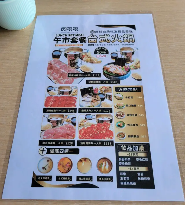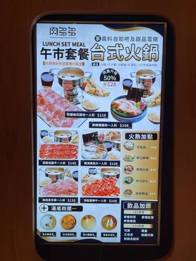 台灣過江龍之肉多多台式火鍋,原來已經開左黎銅鑼灣🤭台式火鍋我最愛就是它們的湯底,尤其是藥膳湯。真心好飲又養生。今日就黎試吓午餐既一人一火鍋先,份量足料,價錢又便宜👍🏻美食推介:💛頂級霜降牛一人鍋:霜降牛肉肉質非常嫩,入口即溶,片片油脂分布均衡,好食👍🏻💛嫩滑黑魚片一人鍋:一片片通透的黑魚片,裝飾為一朵玫瑰🌹只需在鍋內涮3-5分鐘便可以吃,鮮甜味道,沒有任何的腥味👍🏻💛火鍋材料丸及什菜:跟餐會有各一盤的鮮什菜、菇菌、餃子、什丸等,其中一顆丸是我最愛的包心芋頭丸,皮薄芋泥餡十足,好好味👍🏻💛王子麵及刀削麵:跟餐亦可選白飯、王子麵、刀削麵、紅薯粉等等,我選了王子麵及刀削麵,王子麵似我們以前的x字麵口感一樣,而刀削麵煙煙韌韌的口感。💛湯底:當然選了藥膳湯底,藥膳味道超濃超足料,湯底一上已經忍不住喝了半碗🤭。另外,選了沙茶醬湯底,濃濃的沙茶醬,配上牛肉或魚肉也相當出色👍🏻💛甜品:自助吧提供仙草、寒天、芋圓任吃,熱辣辣過後歎一碗超清爽。另外,跟餐還有雪糕一杯。超級滿足😌**侍應招呼相當親切👍🏻👍🏻👍🏻**台式火鍋價格便宜有質素👍🏻👍🏻👍🏻…查看更多
