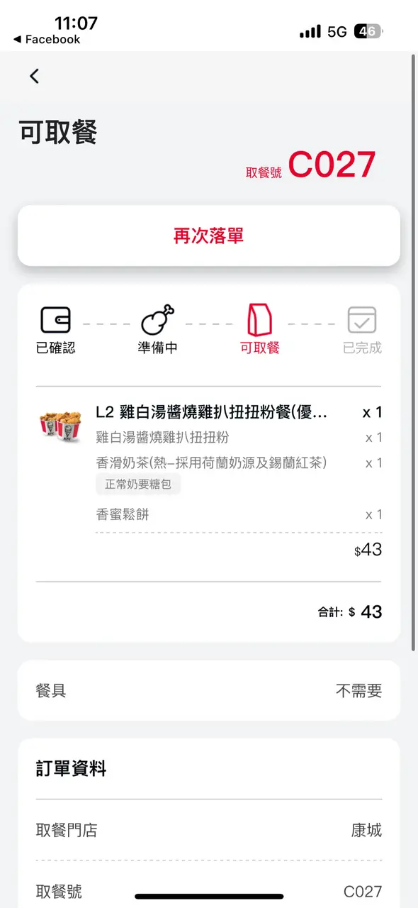 諗住滿心歡喜試新推出嘅雞白湯扭扭粉,喺apps上面落單然後15分鐘之後就話可以取單,落到去先同我講話已經賣晒,點解唔直接喺apps同我講,等我唔使落去戇居居。本身樓下KFC啲食物質素已經好參差,今次真係失望