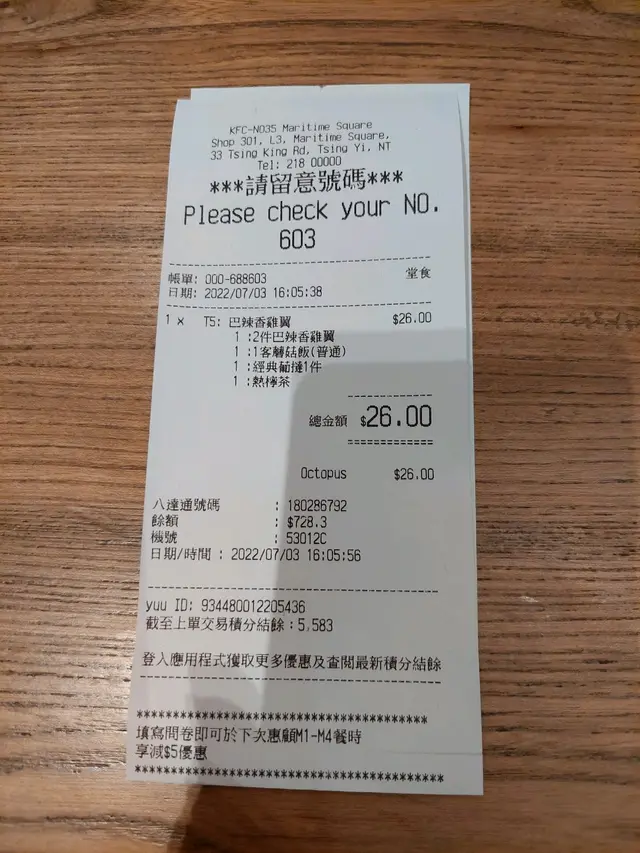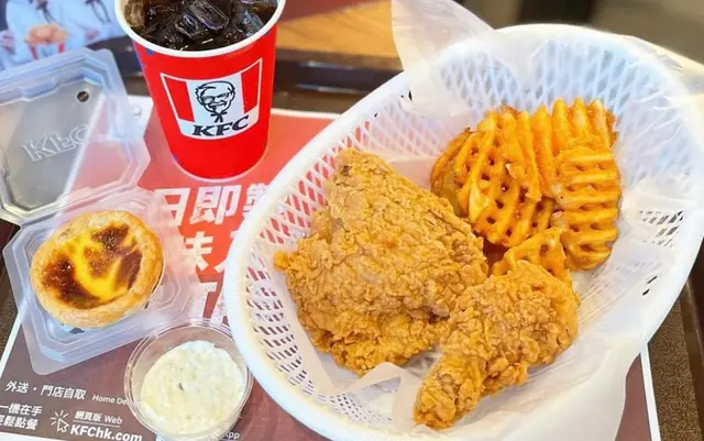 2023.07.23【7.23 便宜的KFC茶餐 @ 青衣城 KFC】一直站著打書釘書中自有顏如玉站著站著看著看著都不知道時間過得這麼快沒有吃午餐就趁現在來一個茶餐吧 青衣城食肆算多但都是貴因為是地鐵上蓋商場食肆的價錢難免夾雜租金早午晚正餐一定貴一點想吃得便宜一點就要花點心思找準時間向茶餐出發難得我們是沒有預計的剛好踏進這個時段KFC不用$30只要$27就有一個由4個Item組成的茶餐太抵了吧?有汽水1杯,有薯蓉1客,有葡撻1個,有雞槌1件百事可樂正常表現薯蓉比以往少一點極重胡椒粉味不錯,有進步葡撻是KFC they do chicken right 以外另一樣非常可以見人的甜點PP的T2香辣脆雞茶餐雞槌是用粟米片包裹來炸的好脆口我的T3狂惹香燒雞茶餐雞槌是甜甜香燒我喜歡這種滋味唯獨美中不足的是將2個餐放在一起幸好我和PP是熟悉的若是不熟絡只有一個籃子大家用餐也不方便星期天沒有去書展在青衣城KFC也是人頭湧湧外傭姐姐最多或者就是因為便宜茶餐緣故吧整體味道:♥♥♥♥♡環境:♥♥♥♡♡服務:♥♥♥♡♡衛生:♥♥♥♥♡抵食:♥♥♥♥♥Deliverule 溫度 ★★態度 ★★味道 ★★♡ 肯德基家鄉雞 (KFC) ♡  ♡ 青衣青敬路31-33號青衣城1 3樓301號舖 ♡查看更多