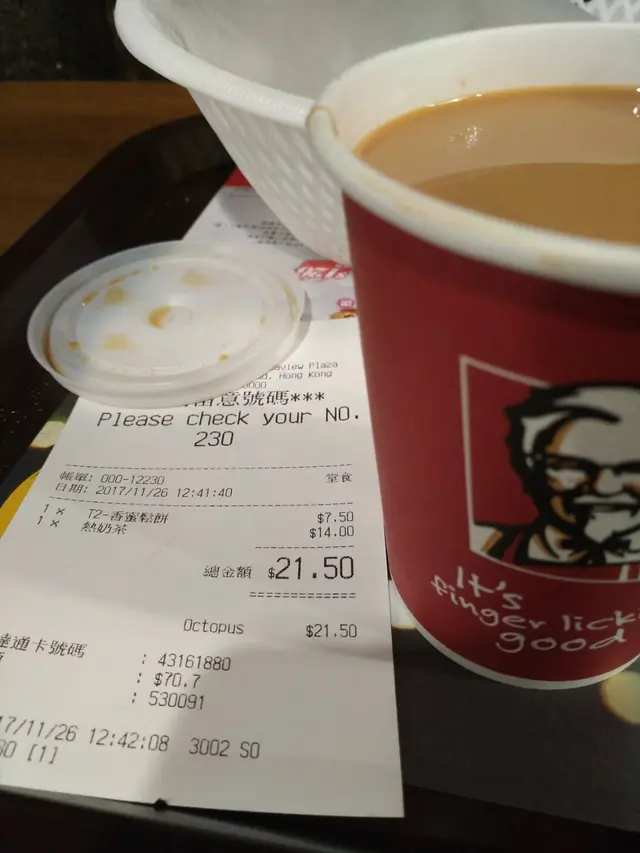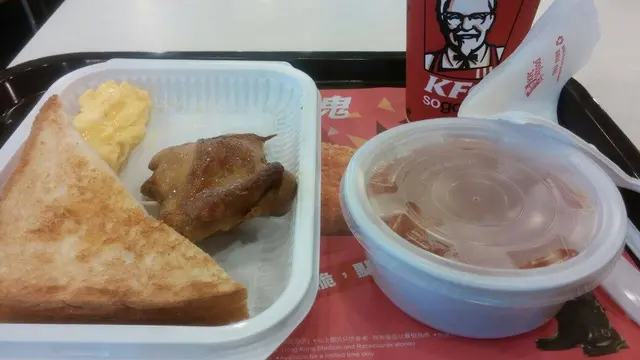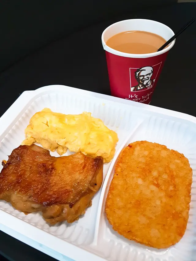 早餐要豐富, 又想慳錢, 我首選KFC。點餐 - 畀錢 - 入袋 - 拎走, 全程都唔洗5分鐘, 啱曬我哋啲趕頭趕命嘅打工仔🏃🏃🏃呢個6號餐, 有薯餅又有雞扒, 一次過滿足我所需, 唔夠嘅話重可以加多個通粉添。特別鐘意佢嘅薯餅, 大大塊, 又夠脆。雞排結實, 唔算嫩滑, 起碼唔會鞋口, 不過就鹹咗啲。一向都唔like快餐蛋, 對我黎講佢就只係一舊有蛋味嘅東西, 你懂的。不過廿幾蚊個餐, 算係咁啦。今日呢個餐用優惠券