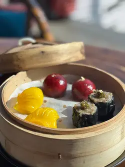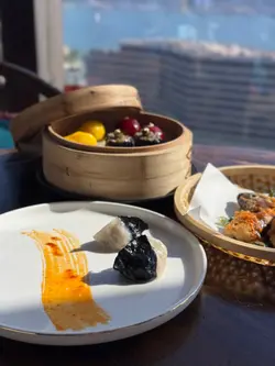 一走出電梯門,我穿越了?四周燈光昏暗。古式古風的磚牆,古代大戶人家的的燈籠,轉眼間來到了老北京。心情雀躍的在大門附近的裝飾牆打了卡。店員引領,穿過一連串的藍色時光走廊,又回來了熟悉的維多利亞港兩岸。看著美麗的維港海景用餐,美景美食相伴,實屬一大享受。點了套餐,店員陸續上菜,服務殷勤有禮。2道前菜很是開胃。擂椒皮蛋的組合對我來說很新鮮,但味道非常的搭配,有點辣,但很好吃!另一道魚香海鮮蓮藕餅調味也很讚,蓮藕口感清爽。三蔥爆炒龍蝦,炒得很香,龍蝦肉彈牙。重頭戲是席前即燒的火焰胡椒片皮鴨,火焰的演出讓人很是驚喜。鴨皮燒過後口感特別香脆,油香味重,味道濃郁,份量還超級大! 可以4個人分享也夠。其後有小魚菜苗,魚湯味鮮,蔬菜苗也很新鮮嫩,清清淡淡的很合時。緊接著是主食:北海道帶子蔥油拌麵。蔥油香味突出,拌麵口感Q彈,而且很掛汁。醬汁感覺愈吃愈辣,但很過癮!最後是超級美的甜點,牡丹花海,美的讓人不忍吃下呀。我們穿梭古今,過了一個開心的夜晚。…查看更多