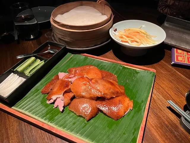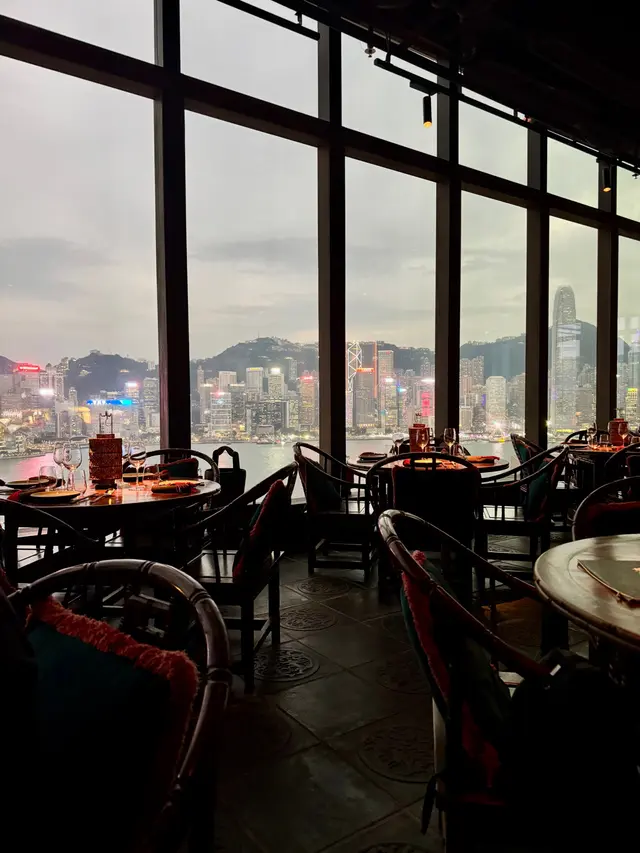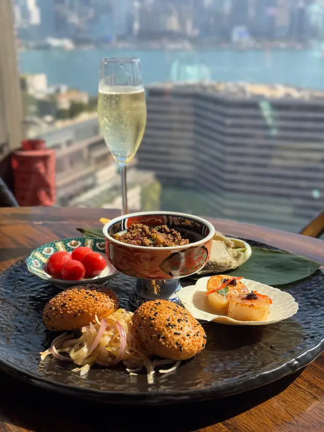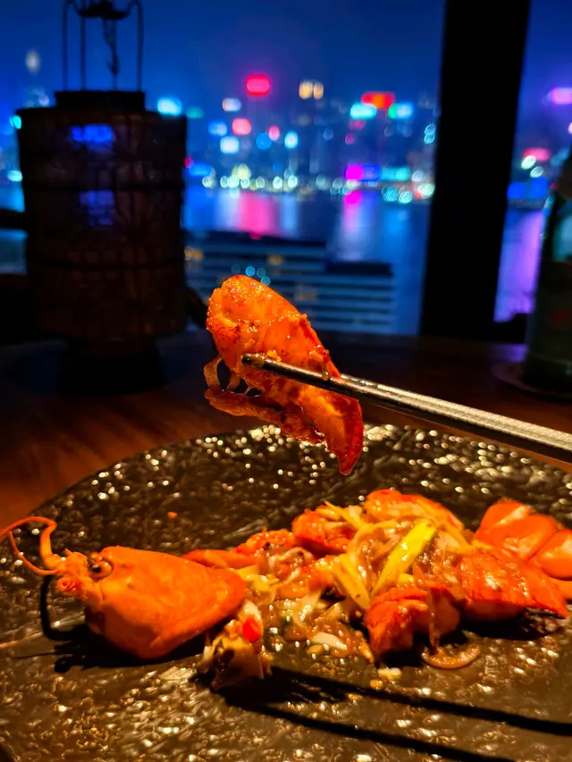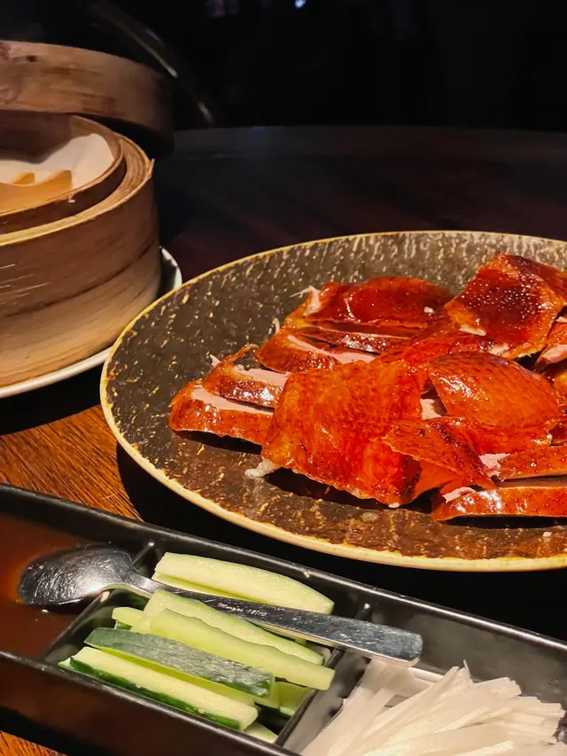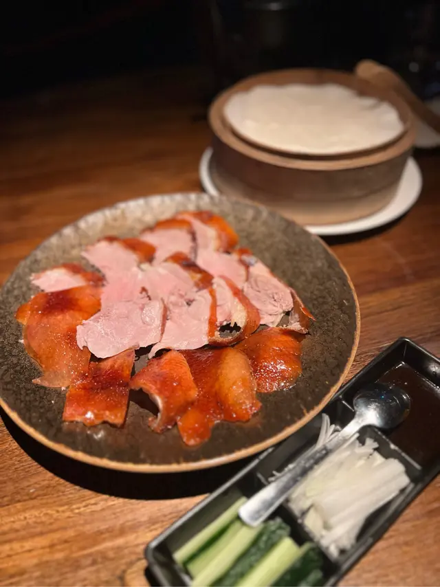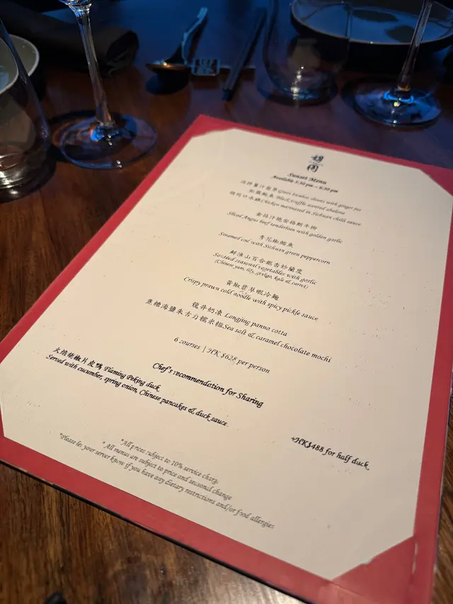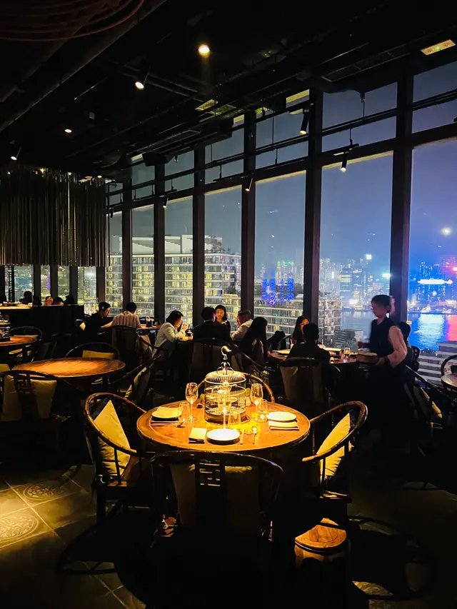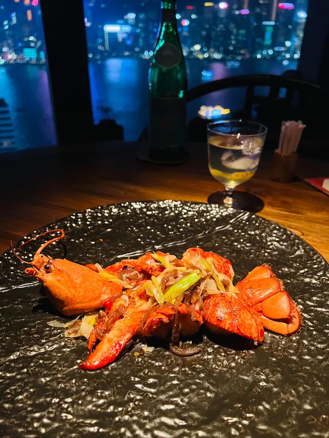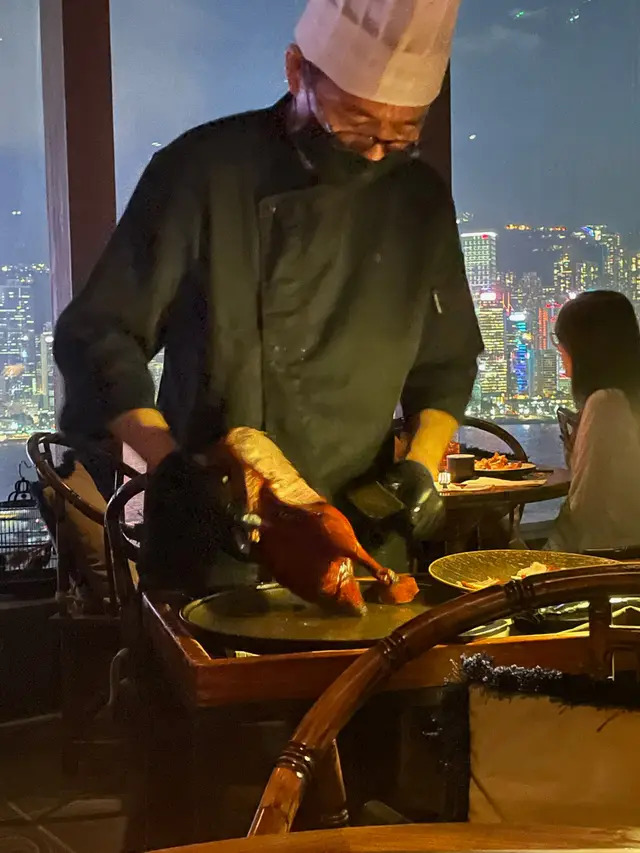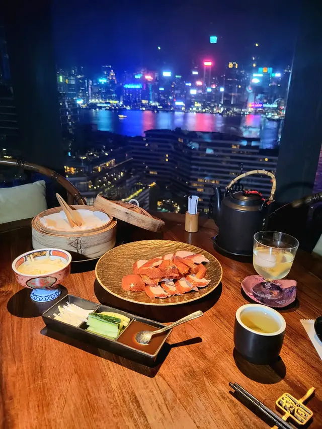 一走出電梯門,我穿越了?四周燈光昏暗。古式古風的磚牆,古代大戶人家的的燈籠,轉眼間來到了老北京。心情雀躍的在大門附近的裝飾牆打了卡。店員引領,穿過一連串的藍色時光走廊,又回來了熟悉的維多利亞港兩岸。看著美麗的維港海景用餐,美景美食相伴,實屬一大享受。點了套餐,店員陸續上菜,服務殷勤有禮。2道前菜很是開胃。擂椒皮蛋的組合對我來說很新鮮,但味道非常的搭配,有點辣,但很好吃!另一道魚香海鮮蓮藕餅調味也很讚,蓮藕口感清爽。三蔥爆炒龍蝦,炒得很香,龍蝦肉彈牙。重頭戲是席前即燒的火焰胡椒片皮鴨,火焰的演出讓人很是驚喜。鴨皮燒過後口感特別香脆,油香味重,味道濃郁,份量還超級大! 可以4個人分享也夠。其後有小魚菜苗,魚湯味鮮,蔬菜苗也很新鮮嫩,清清淡淡的很合時。緊接著是主食:北海道帶子蔥油拌麵。蔥油香味突出,拌麵口感Q彈,而且很掛汁。醬汁感覺愈吃愈辣,但很過癮!最後是超級美的甜點,牡丹花海,美的讓人不忍吃下呀。我們穿梭古今,過了一個開心的夜晚。…查看更多