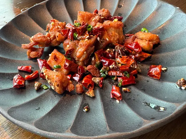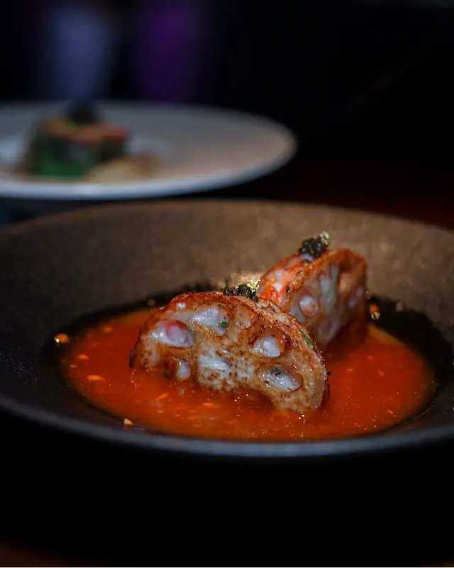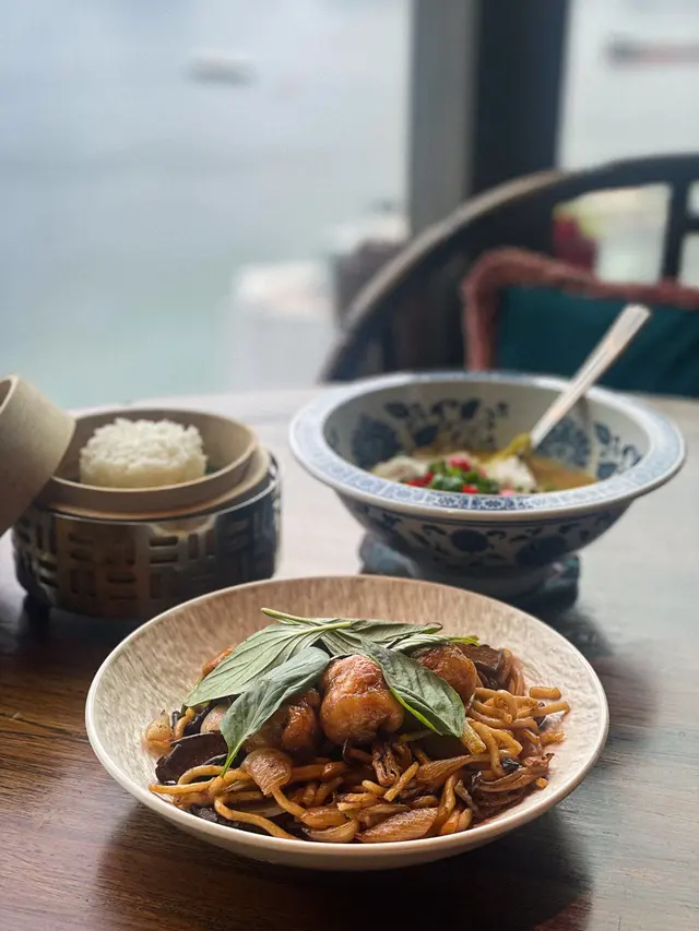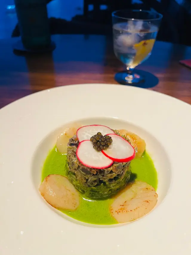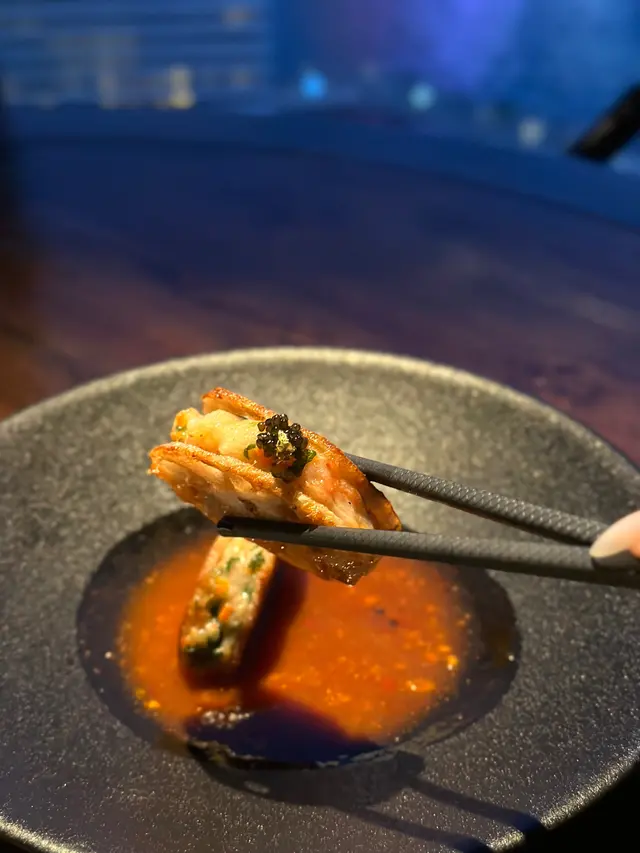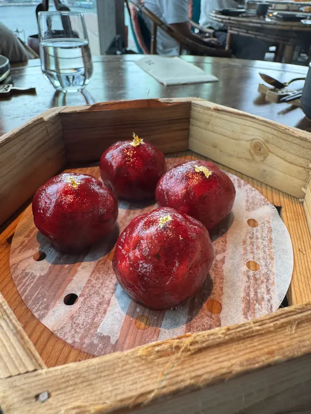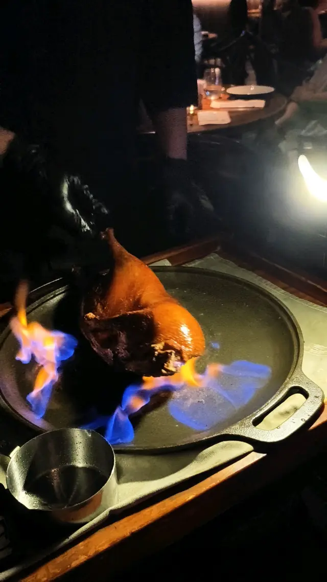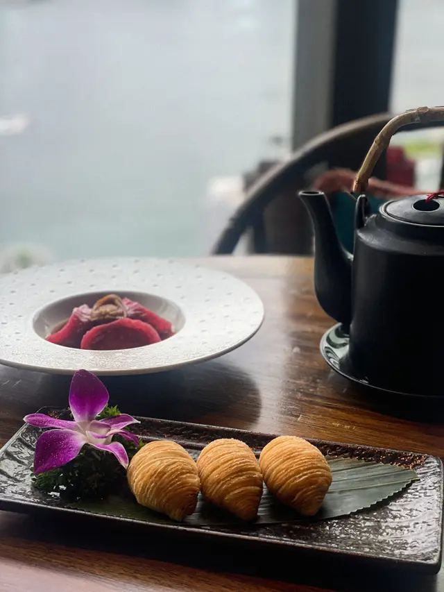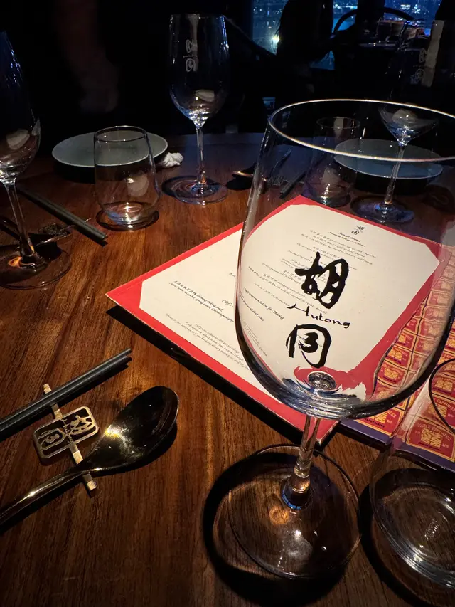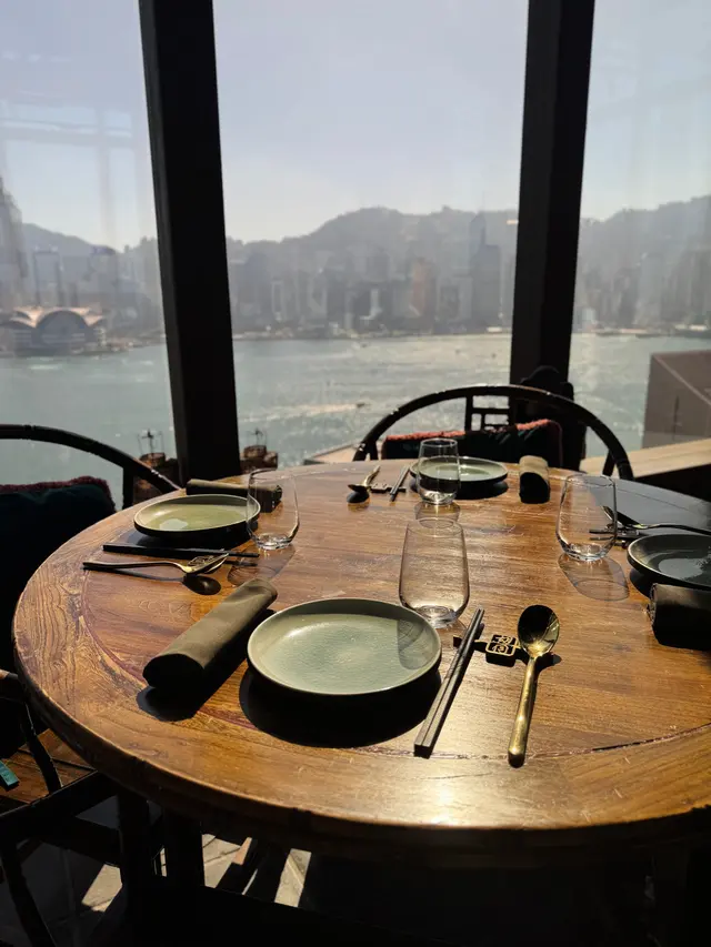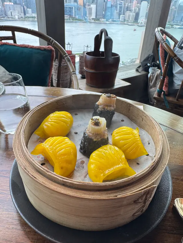 一走出電梯門,我穿越了?四周燈光昏暗。古式古風的磚牆,古代大戶人家的的燈籠,轉眼間來到了老北京。心情雀躍的在大門附近的裝飾牆打了卡。店員引領,穿過一連串的藍色時光走廊,又回來了熟悉的維多利亞港兩岸。看著美麗的維港海景用餐,美景美食相伴,實屬一大享受。點了套餐,店員陸續上菜,服務殷勤有禮。2道前菜很是開胃。擂椒皮蛋的組合對我來說很新鮮,但味道非常的搭配,有點辣,但很好吃!另一道魚香海鮮蓮藕餅調味也很讚,蓮藕口感清爽。三蔥爆炒龍蝦,炒得很香,龍蝦肉彈牙。重頭戲是席前即燒的火焰胡椒片皮鴨,火焰的演出讓人很是驚喜。鴨皮燒過後口感特別香脆,油香味重,味道濃郁,份量還超級大! 可以4個人分享也夠。其後有小魚菜苗,魚湯味鮮,蔬菜苗也很新鮮嫩,清清淡淡的很合時。緊接著是主食:北海道帶子蔥油拌麵。蔥油香味突出,拌麵口感Q彈,而且很掛汁。醬汁感覺愈吃愈辣,但很過癮!最後是超級美的甜點,牡丹花海,美的讓人不忍吃下呀。我們穿梭古今,過了一個開心的夜晚。…查看更多