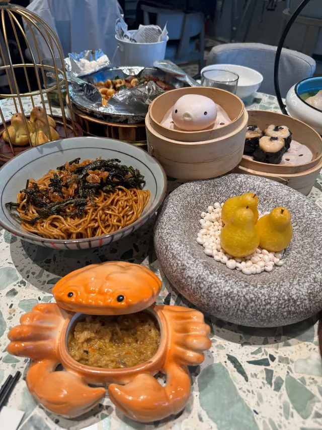 這次和朋友去了啟德 AIRSIDE 新開的潮州菜點心酒樓,整體感覺頗為驚喜。餐廳環境走的是典雅高貴的中國風調子,木雕屏風與柔和燈光交織出一種靜謐的氣氛。服務生衣著整潔,態度親切,既有規矩又不失溫度,一坐下就讓人放鬆。點心質素方面,創意度與味道兼備:**佛跳牆灌湯餃** —— 這道幾乎是鎮店之寶。湯底濃郁,帶點花膠與瑤柱的鮮香,油而不膩。餃皮薄滑,包裹着滿滿精華,咬開那一瞬間湯汁在口中爆開,有點誇張地說,是會讓人靜下來細味的那種。**天鵝酥(汕頭滷水鵝肉)** —— 外形非常可愛,一上桌便吸引全場目光。酥皮細緻鬆化,內裡是略帶鹹香的滷水鵝肉,滷香與酥香交錯,甜度恰到好處。**鳳梨雀仔(鳳梨酥)** —— 賣相討喜,小巧的雀仔造型精緻可愛。味道偏甜,鳳梨餡酸甜開胃,如果配杯清茶,剛剛好中和。**金魚戲水(湯蝦餃)** —— 外層晶瑩剔透,蝦肉鮮彈,湯底輕盈清甜,形態似游動的金魚,食前食後都讓人忍不住拍照一番。**潮汕落湯錢** —— 糯米粉皮軟糯,內餡五仁香濃但不過分甜膩,咬下去有層次感,頗具傳統風味。**紫蓉八爪魚包** —— 外形幽默可愛,紫薯餡香滑綿密,甜度低調,反而讓人愈吃愈想再來一口。**黑蒜蝦燒賣** —— 是意想不到的驚喜。黑蒜的甘香與蝦肉的鮮味平衡得很好,比傳統燒賣更添層次。**熊仔朱古力包** —— 優勝在造型,香濃朱古力流心,加上柔軟包皮,孩子們(包括大人)都難以抗拒。**桃膠雪耳紅棗** —— 為一餐畫上清爽的句號。甜湯不過甜,桃膠滑潤,雪耳爽口,紅棗味溫潤收尾。總結來說,這間潮州酒樓在傳統與創意之間取得了良好平衡。環境優雅、菜式精緻、味道紮實,不只是「好打卡」,而是真材實料有心思的那種。 下次想試試他們的主菜部分,相信也會有驚喜。…查看更多