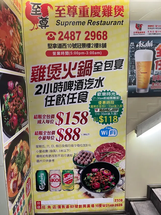 至尊重慶雞煲真係細細個就聽過呢個名,價錢好似冇變過咁滯,$158 只係一字頭就可以任飲,任食廿幾款野食,仲可以食兩個鐘仲有啲乜嘢可以要求?一入到去店員就帶我哋坐低,未開始食雞煲之前就梗係要行一個圈睇吓有啲乜嘢可以攞啦~門口位置就有好幾樣小食可以食:有魚蛋啦茶葉蛋豬血涼拌青瓜等等 之後隔離就係調味料區,佢嘅醬料選擇比我想像中多好多有沙嗲醬秘製雞雞醬,濃味人最愛!! 之後返返黎,店員就問我哋雞煲要咩辣度,因為我哋唔係太食得落所以我哋就揀咗BB辣~~過咗一陣雞煲就上黎啦~嘩真係好香,好濃味之人最愛!雞件好有肉唔會好多碎骨 食晒啲雞之後, 跟住就落湯開始任食喇~~ 肉類有肥牛雞豬等等海鮮就有青口,脆鯇魚、蝦 、水魷八爪魚仔花膠等等 當中大推青口!食多幾轉就輕易回本呀丸類都有好多選擇,我哋主力食蟹子丸囉同埋芝士丸!另外佢仲有年糕!年糕超索味,嘩意外地好想狂encore!菇蔬菜冰豆腐粟米係每次打邊必備蔬菜~~~ 最後飲品選擇都好多,除咗各類汽水仲有多款啤酒,真係好啱男士去食另外仲有每人可以攞一杯雪糕架~…查看更多
