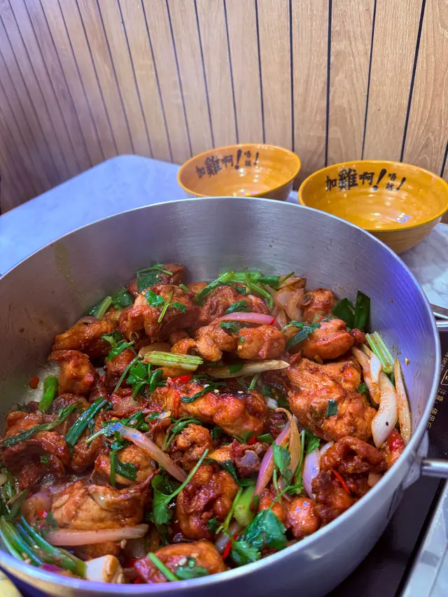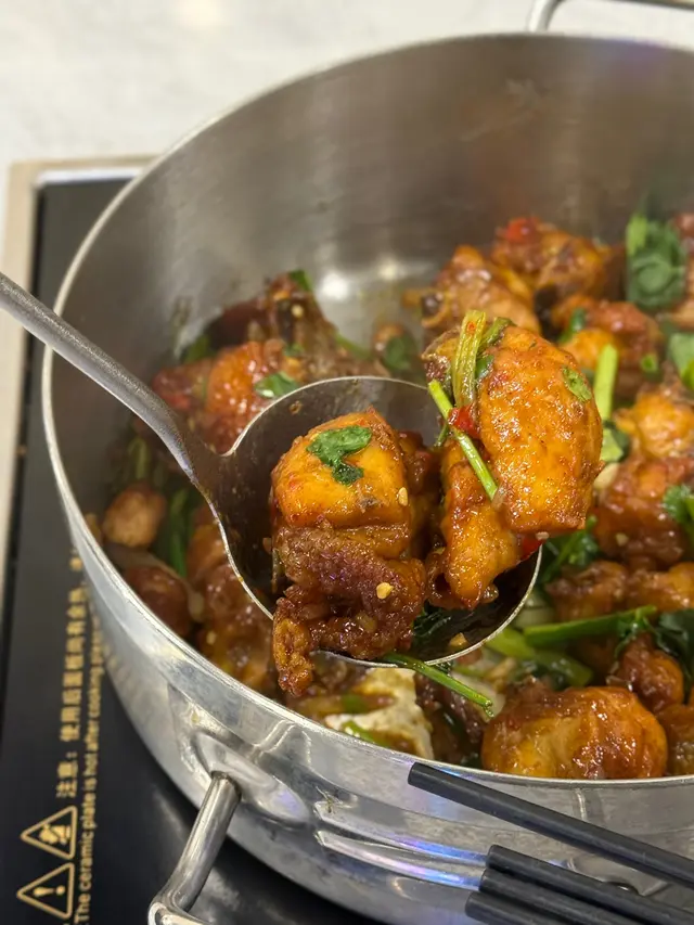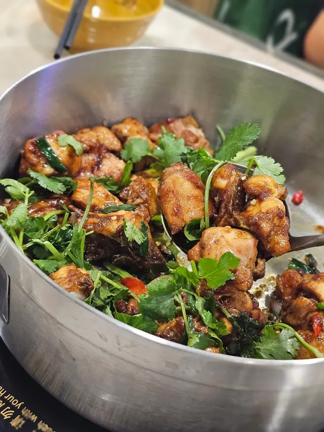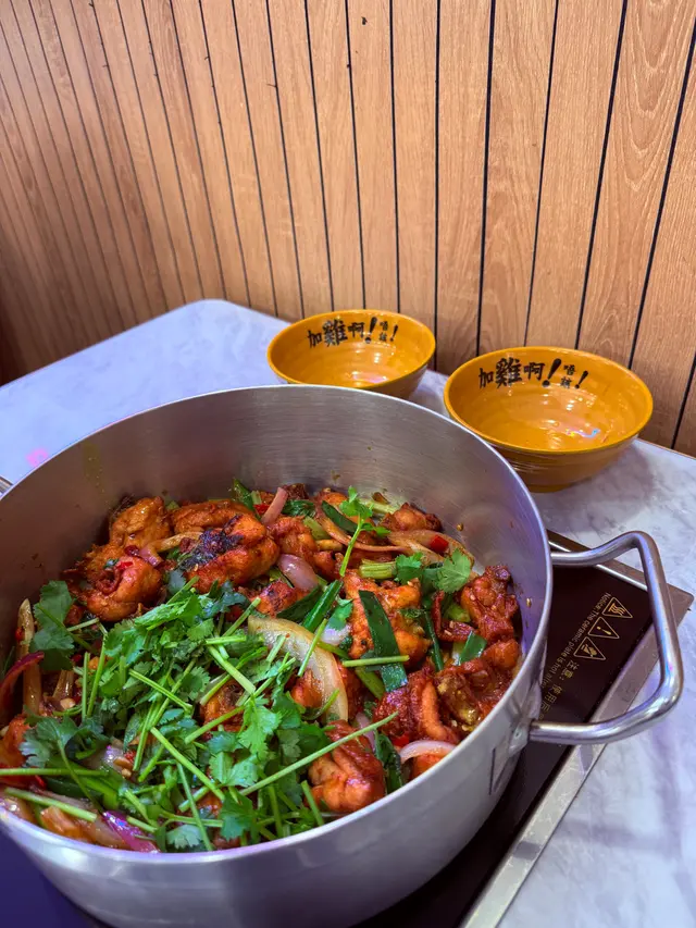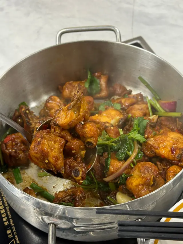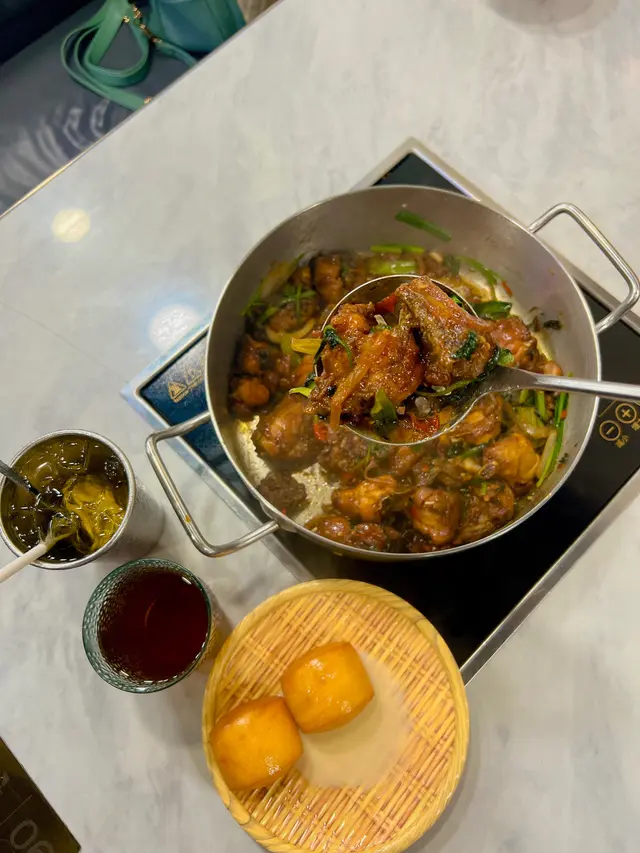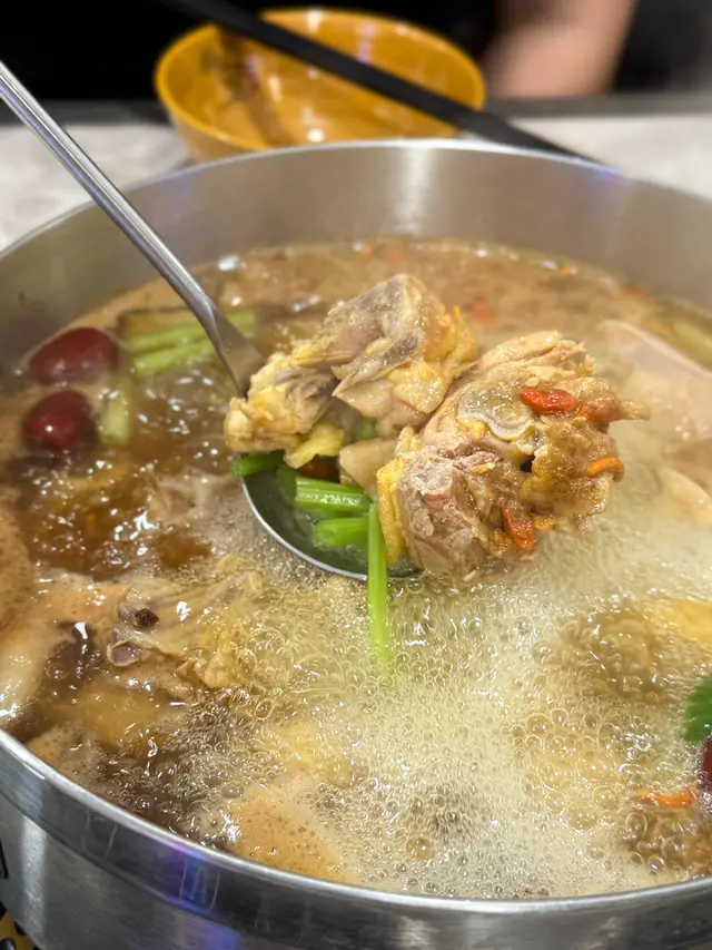 餐廳主打任飲任食雞煲打邊爐🥘平日每位$188性價比極高💯但唔包括收費小食及啤酒🍺至尊惹味雞煲🐔🍲今次主要係食惹味雞煲,上枱後店員會幫手將已醃製好的雞件同芫茜、芹菜、洋蔥🧅及蔥等香料炒至入味,雞件份量十足👍,叫左小辣🌶️,辣味程度可跟自己口味決定,每件雞件香辣惹味,啖啖肉好入味,不同部位的雞件食落有不同口感,友人鍾意食雞脾的位置肉質嫩滑啲,雞件食到七七八八可以用手機落單重點係無限加雞‼️,但想留肚打邊爐關係,只係再追加多一人份量雞件,平時唔係食肉獸的我,惹味雞煲令我忍唔住一件接一件😂炸饅頭🫓外皮炸到黃金香脆,內裡軟熟,再淋上煉奶一齊食真係冇得輸😋推介👍🏻打邊爐🍲食完雞煲後再加湯開始打邊爐屬雙重享受,火鍋配料超過50款選擇,包括有肉類,丸類,蔬菜及粉麵等,食完雞煲已有七成飽,所以打邊爐配料只叫左幾款黎食油炸鬼:好少見有油炸鬼,滾一滾就食得魷魚🦑:食落爽口彈牙,唔會韌芝士竹輪🫔:要小心熱咬落去食到芝士oppa魚板🍢:外形好似韓國的魚糕,唔想淋就唔好滾太耐娃娃菜🥬及粟米🌽:吸盡湯底精華辣辣地好惹味飲品任飲🥤除左罐裝汽水🥤外,仲有茶餐廳普遍飲品(咖啡,奶茶,檸檬茶及菜蜜等),仲有豆漿及羅漢果杞子菊花茶等羅漢果杞子菊花茶:飲到淡淡菊花茶味,食完雞煲飲返杯清熱解膩…查看更多