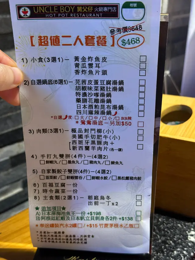如果唔係已經好飽勁想encore一睇就知兩種丸係真材實料手打出嚟食落有咬口彈牙第一次食手打豬肉丸所以超驚喜自家製餃子雙拼(4選2)鮮蝦雲吞同鮮蝦水餃每件入面都有原隻鮮蝦真皮薄饀靚百福豆腐有成盒,好滑時令蔬菜紹菜,索晒啲沙嗲湯勁好味主食二選一沙嗲湯一定係食公仔麵,依度仲係出前一丁超開心,仲比埋包粉你完全唔需要落,沙嗲加麵係最正西班牙黑豚肉同牛肉一樣厚薄適中,雪花均勻因為豬肉我會淥耐啲,但都依然好食黃金炸響鈴金黃色,外層明顯嘅鹹蛋醬金香酥脆嘢飲係兩罐汽水或者加錢轉一瓶竹蔗茅根竹蔗茅根都係自家製,足料