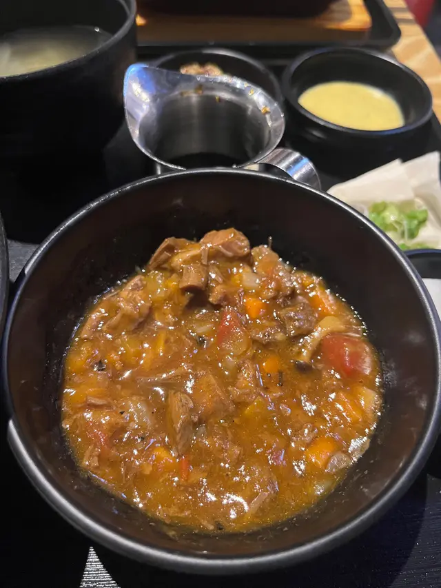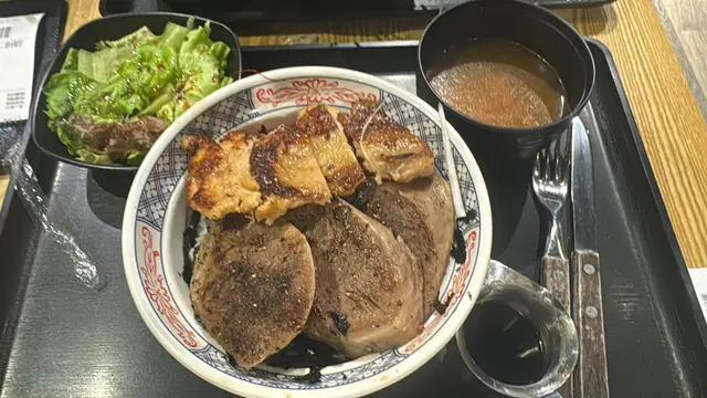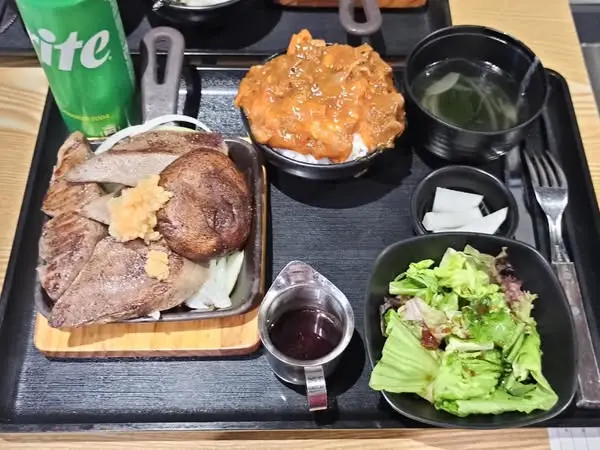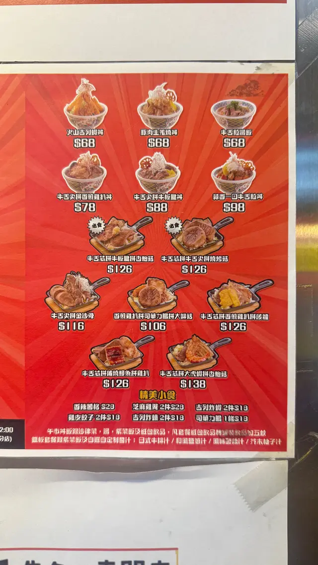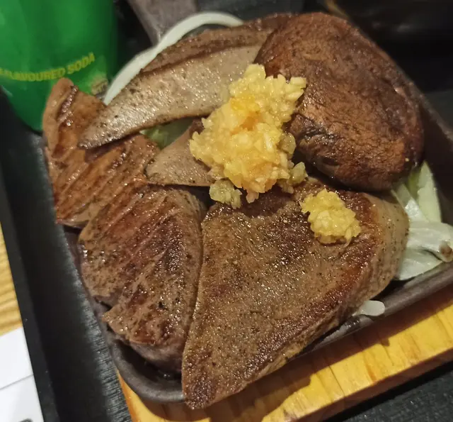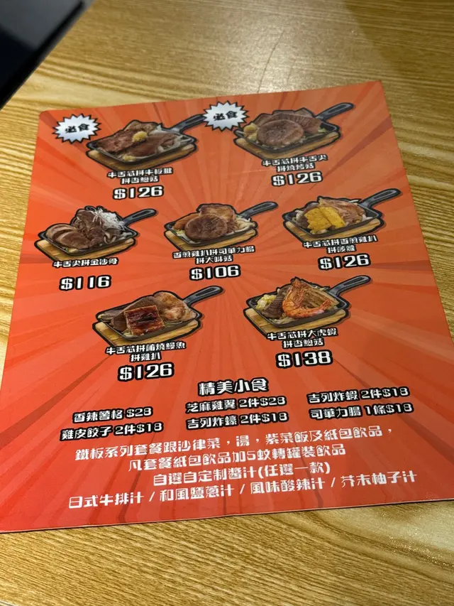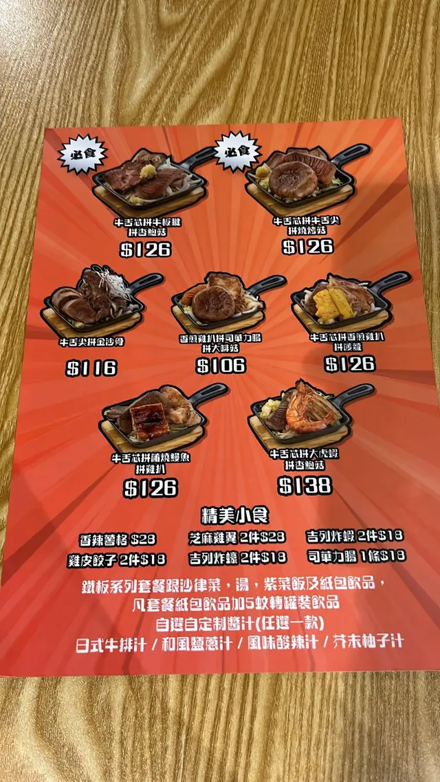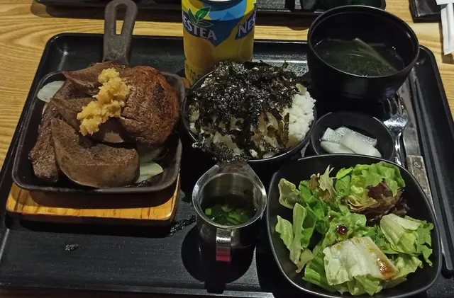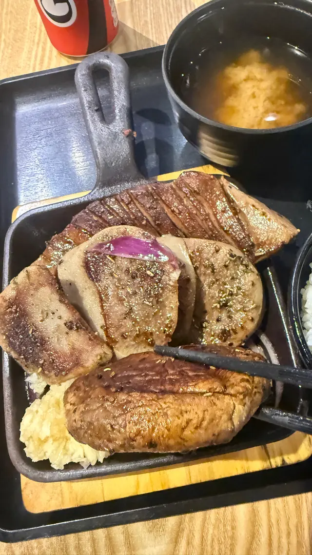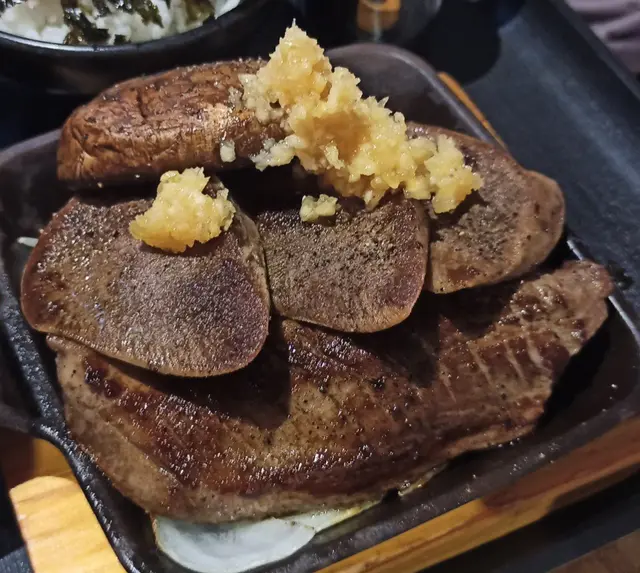 餐廳主要有兩類套餐:鐵板系列,丼飯套餐。因為嚟係食牛舌,兼且只係鐵板先有牛舌芯,所以毫無怨念揀鐵板系列。鐵板系列:牛舌芯拼牛舌尖拼大啡菇($98)醬汁有日式牛扒汁、和風鹽蔥汁、風味酸辣汁(激辣),見到激辣有啲驚,所以都係要咗牛扒汁同鹽蔥汁算了。套餐包沙律、湯、漬物、飯、飲品,要咗兩個套餐。一個紫菜白飯套餐(+$28),另一個紅酒汁燴牛舌根飯套餐(+$33)。大約十分鐘,兩份餐一齊上枱。鐵板上有一條牛舌芯、三片牛舌尖、一個大啡菇,大量洋蔥墊底,面頭有蒜蓉。牛舌芯約四吋長,厚身,外層表面洒上黑椒調味,咬落十分彈牙,中間仍有少許粉嫩,淋上少許牛扒汁提味。牛舌尖係先煮腍再煎香表面,所以咬落十分軟嫩,表面同樣洒上黑椒調味,加埋蒜蓉增加味道層次。大啡菇味道正常,煮得唔乾仍鎖住水份,又係洒上黑椒調味。紅酒汁燴牛舌根飯,味濃,牛舌根切粒煮得好腍,味道可以。沙律清爽;湯偏清淡;漬物酸蘿蔔開胃;飲品係罐裝。整體味道不錯,但鐵板上三款食材都洒上黑椒,而且都幾重手,所以食落辣味過多,我覺得可以減一半嘅黑椒份量。PS:全日不收加一服務費。查看更多