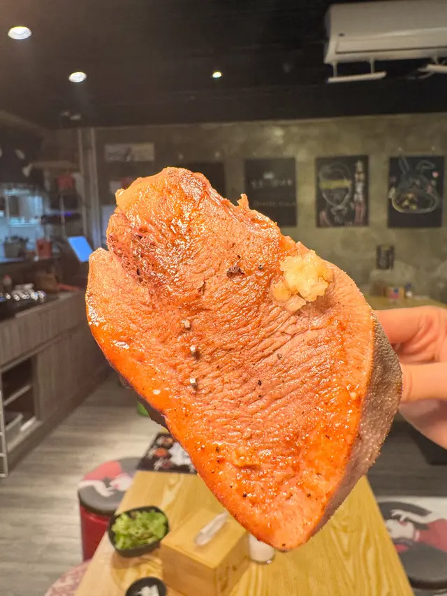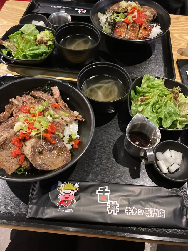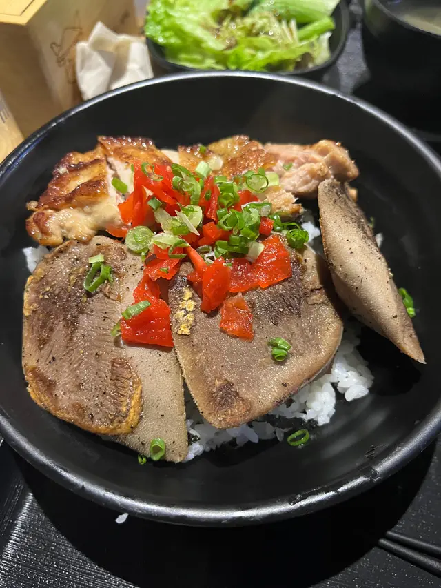 今日同朋友去觀塘附近行街,聽朋友講工廈既特色小店都係唔錯既選擇,就去了好出名嘅駱駝漆大廈睇下有咩食,最後揀左一間岩哂我牛魔王既餐廳。一入到餐廳都見到店員幾好既招呼,提供左餐牌。餐廳主要有兩種套餐選擇:有鐵板系列同丼飯套餐。我因為都肚餓選擇左丼飯套餐,套餐包沙律、湯、漬物、飯、飲品。大約十分鐘左右,兩份餐一齊上枱。牛舌尖拼雞扒雞($88)全是肉的一個搭配,煎雞扒碎上,肉嫩多汁,牛舌尖爽又多汁,還有油香!配了和風鹽蔥汁,味道有點像平常的蔥油味,但會清淡一點,不會太油膩!醬汁有日式牛扒汁、和風鹽蔥汁、風味酸辣汁(激辣),所以都係淋咗牛扒汁。沙律清爽;湯偏清淡;漬物酸蘿蔔開胃;飲品係罐裝。朋友最後揀左牛舌芯拼牛舌尖拼大虎蝦 ($98)牛舌份量好多,超級好食同抵食,呢個價錢無得輸!牛舌芯vs牛舌尖:兩者都好厚,舌芯較淋身,舌尖較爽口,兩者搭配都不錯大虎蝦:濃濃黑椒味,非常惹味~整體味道不錯,而且食物質素唔錯,配搭醬汁岩岩好,我覺得會在黎食多一次。PS:全日不收加一服務費,食完仲有獎抽。查看更多