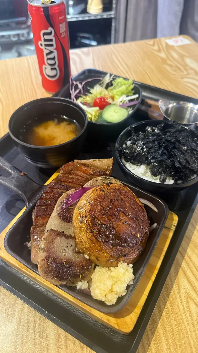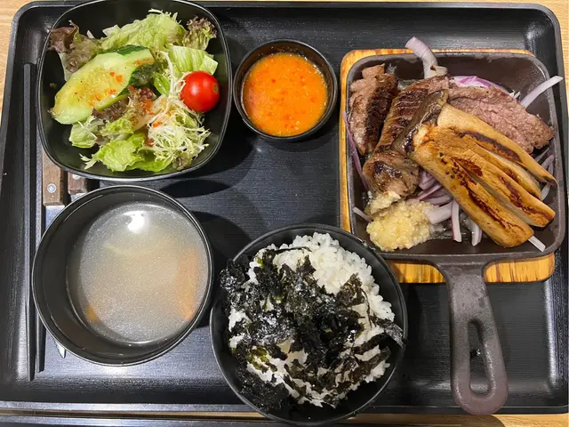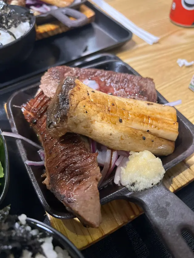 喺觀塘駱駝漆大廈嘅呢間餐廳用餐,真係一個驚喜!😋 我點咗大啡菇拼牛舌芯拼牛舌尖同埋紫菜飯,一上枱就聽到鐵板嘅“咋咋聲”好吸引!🔥牛舌芯厚身但又幼滑,切開後仲係粉粉紅紅,口感爽口,仲有油脂香氣,停唔到口!🤤 牛舌尖外面脆脆地,對於鍾意爽口牛舌嘅我就好岩我。💖 大啡菇都比我預期中juicy,口感豐富!🍄底部嘅洋蔥經過煎炒,配上甜甜嘅牛扒汁,係絕既!🍽️ 原本我覺得碗飯太多,點知最後我竟然全都食晒!😅餐廳係開放式廚房令人安心,座位擺設唔算擠迫,環境舒適,真係值得再來!✨🥢🍚查看更多